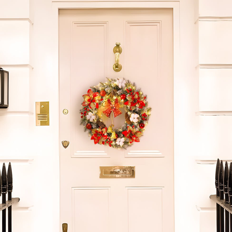 Cette couronne de Noël LED classique présente des cloches et un éclat doré, apportant une touche lumineuse et festive aux espaces de fête. Sa construction en PVC et plastique la rend légère et facile à accrocher sur portes, murs ou fenêtres.