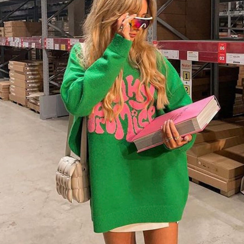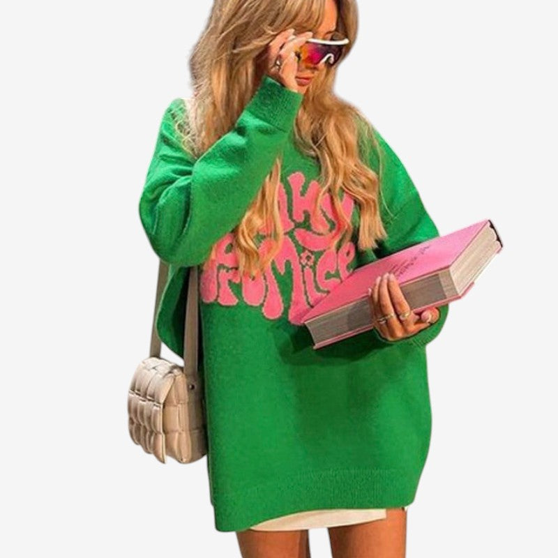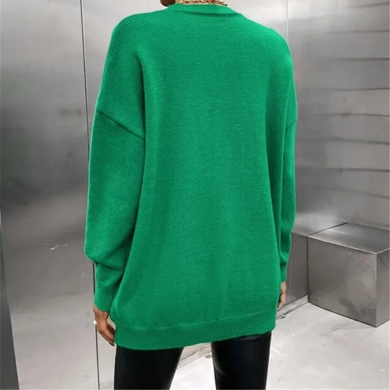 Ce pull présente un col rond et des manches longues. Les panneaux sont unis et la structure générale est régulière. La coupe ample offre une apparence simple et harmonieuse.