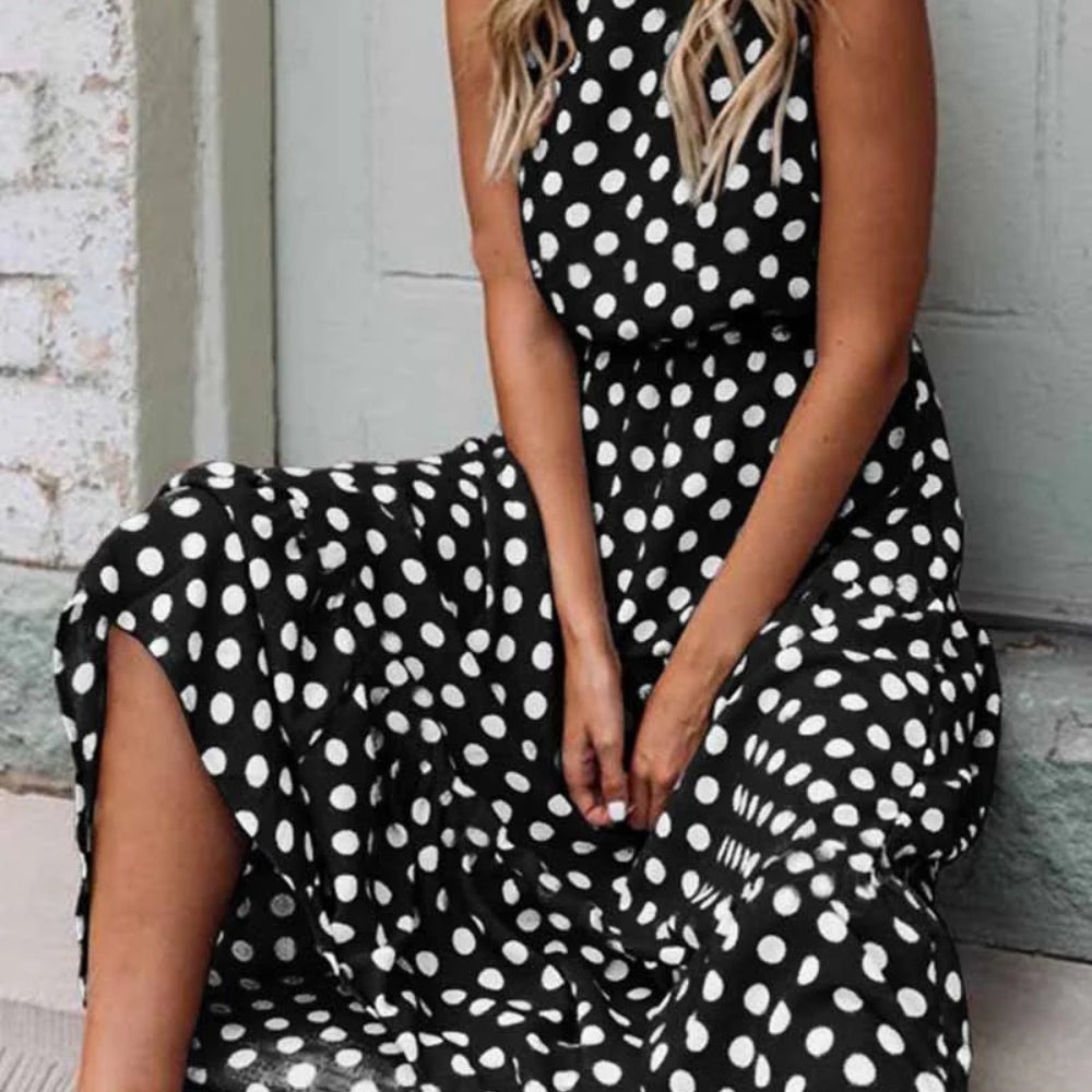 Cette robe sans manches présente un col rond et une coupe ample décontractée, offrant confort et style sans effort. Le motif à pois classique ajoute une touche ludique, idéale pour les sorties décontractées ou les réunions informelles.