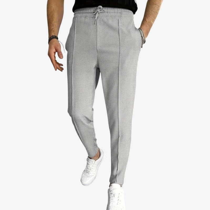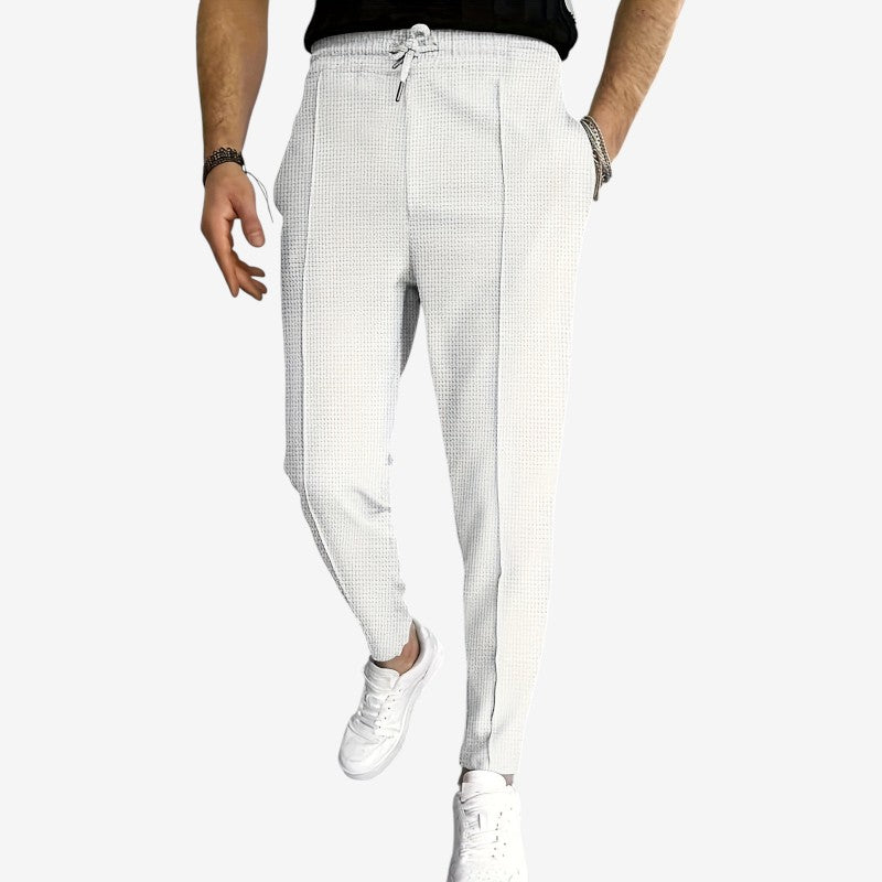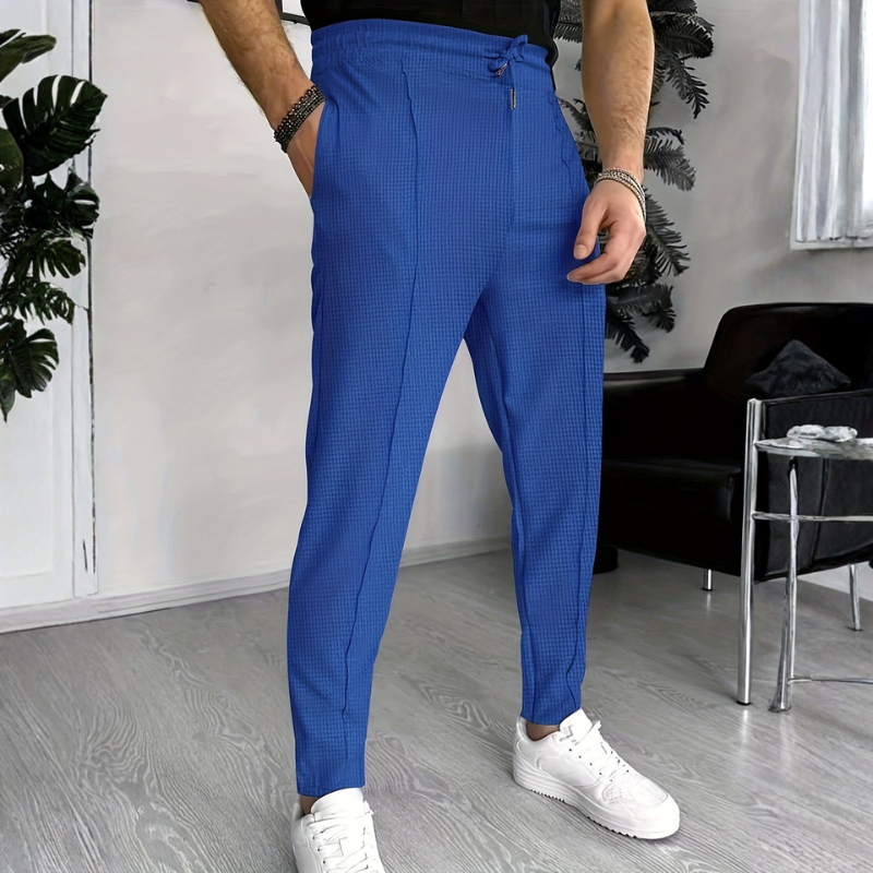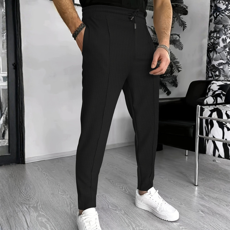 Le pantalon Edward présente une coupe ample avec une taille haute et des jambes larges, alliant confort et style pour un usage quotidien ou décontracté.