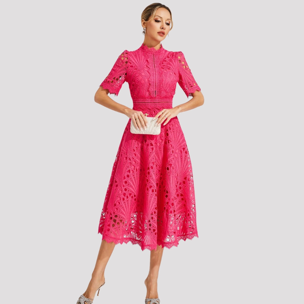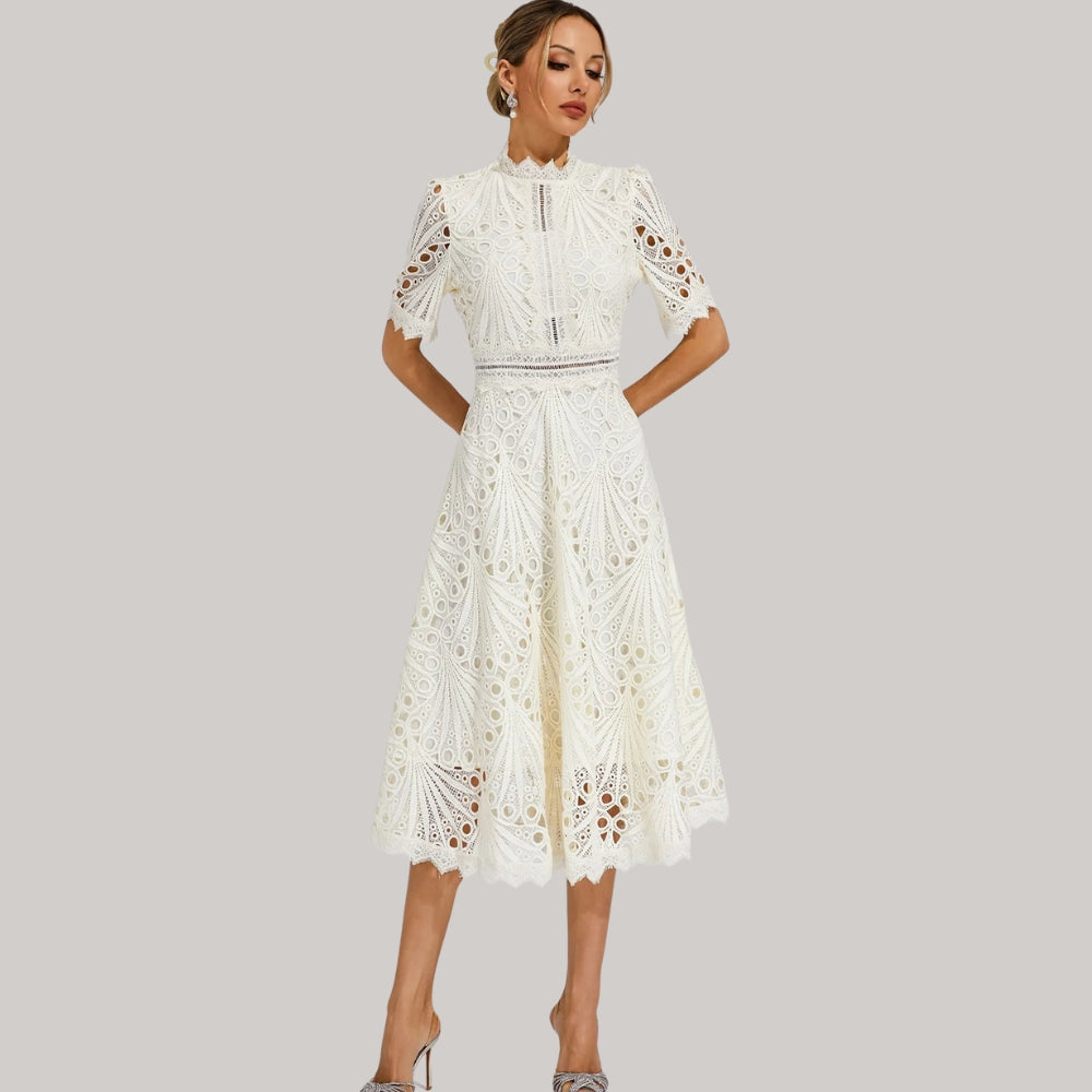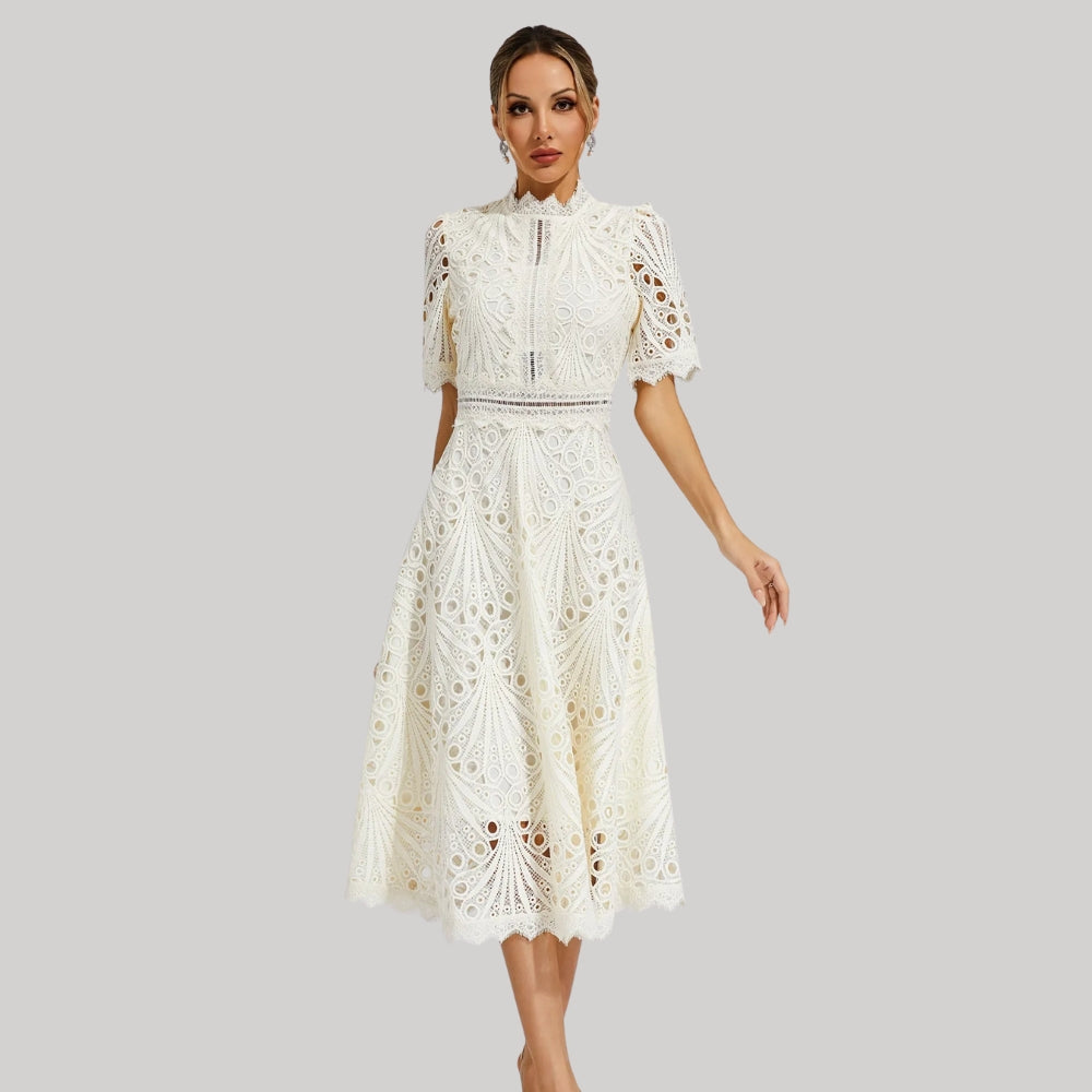 Isabel – Robe Midi à Manches Courtes avec Détails en Dentelle Ajourée