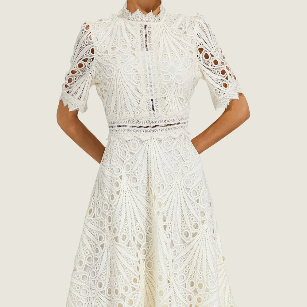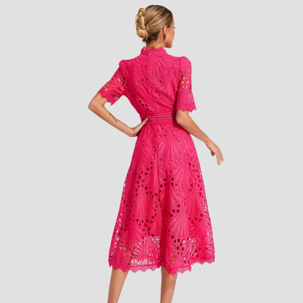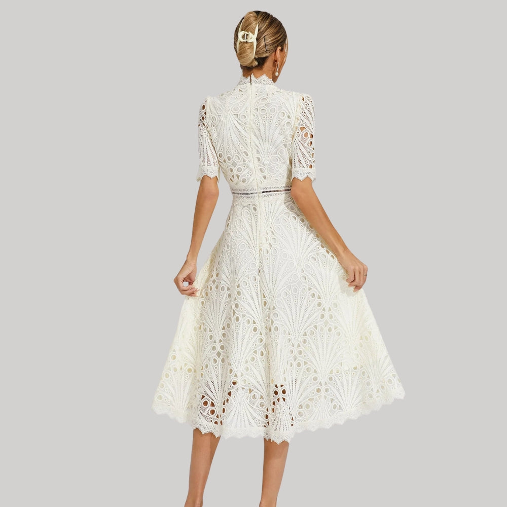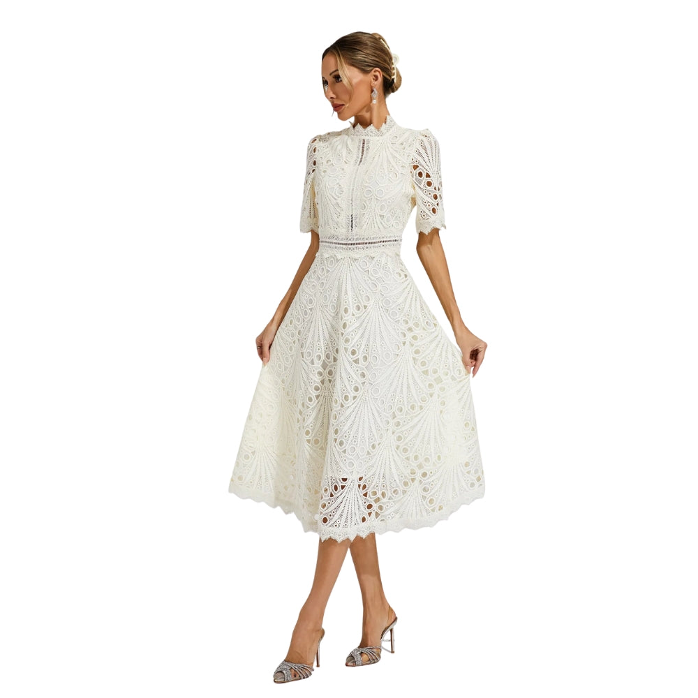 Isabel – Robe Midi à Manches Courtes avec Détails en Dentelle Ajourée