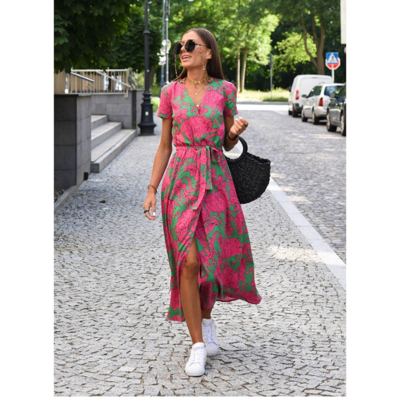 Entrez dans un monde d'élégance avec cette robe longue à imprimé floral, conçue pour vous démarquer. Son décolleté en V apporte une touche de féminité, tandis que ses manches courtes offrent un confort optimal sans sacrifier le style. Avec sa silhouette flatteuse et son motif floral audacieux, cette robe allie chic et décontracté en toute simplicité. Parfaite pour les sorties en journée comme pour les soirées, elle est un incontournable pour toute garde-robe.