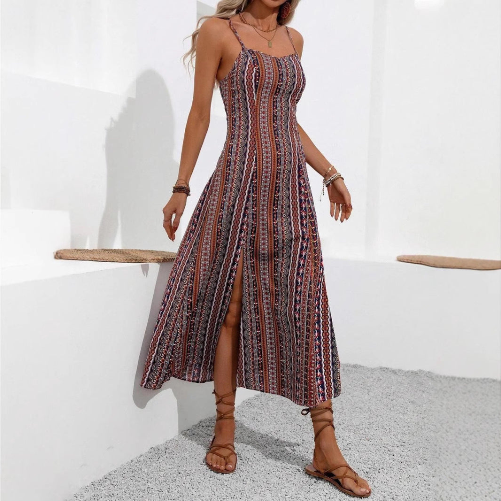 Isla est conçue pour s'adapter naturellement à chaque pas, avec une silhouette longue et gracieuse et une fente sur le côté pour plus de mouvement. Les bretelles délicates et le corsage en forme apportent une forme flatteuse, tandis que les motifs vibrants apportent une touche d'insouciance et de créativité au look.