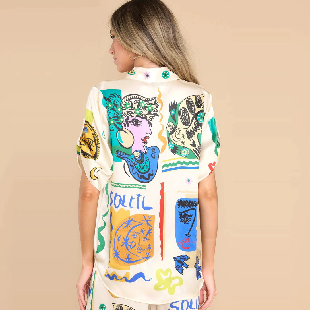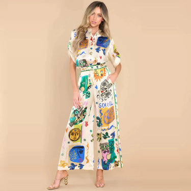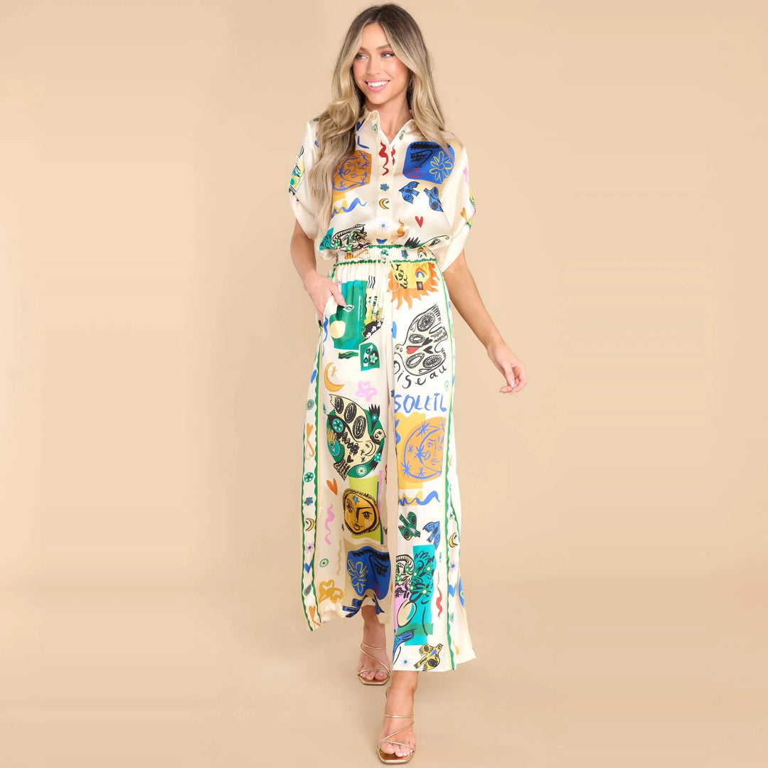 Cet ensemble chemise et pantalon est une superbe démonstration de créativité, avec une gamme ravissante d'imprimés floraux artistiques qui apportent de la couleur et de la fantaisie à votre garde-robe. La chemise présente un col pointu et un devant boutonné, parfaitement associé à un pantalon ample fluide pour un ensemble chic et confortable. Fabriqué à partir de tissu léger, cet ensemble vous assure de rester élégant sans sacrifier le confort.
