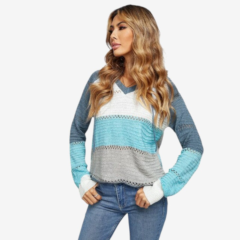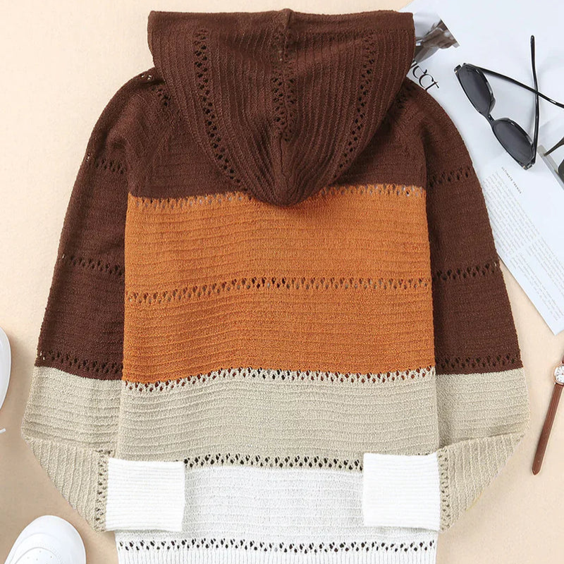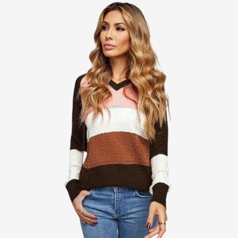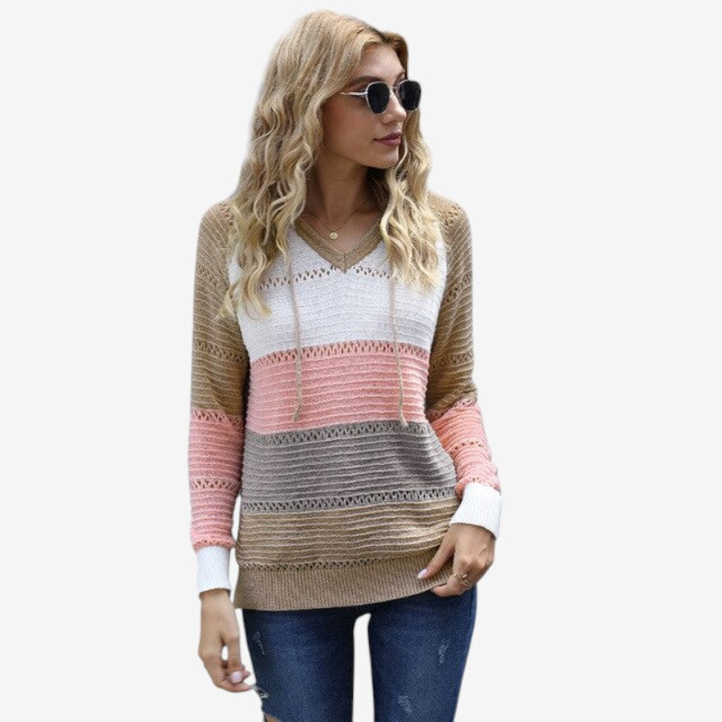 Laura – Hoodie Tricoté à Manches Longues avec Col en V et Doublure Rayée