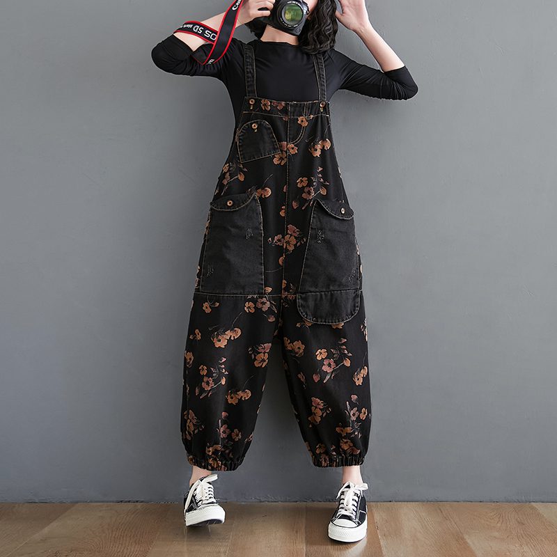 Cette salopette présente une coupe sarouel ample avec un entrejambe bas et une structure décontractée. La surface est entièrement recouverte d'un imprimé floral sur fond noir. Un plastron avant se prolonge harmonieusement dans le pantalon, conservant un motif continu.