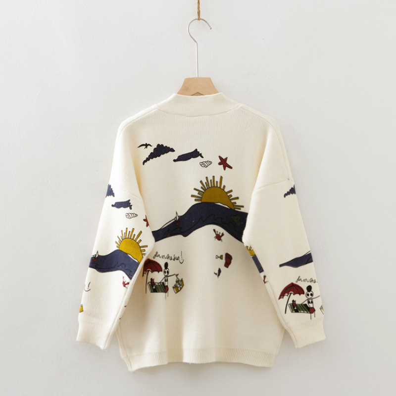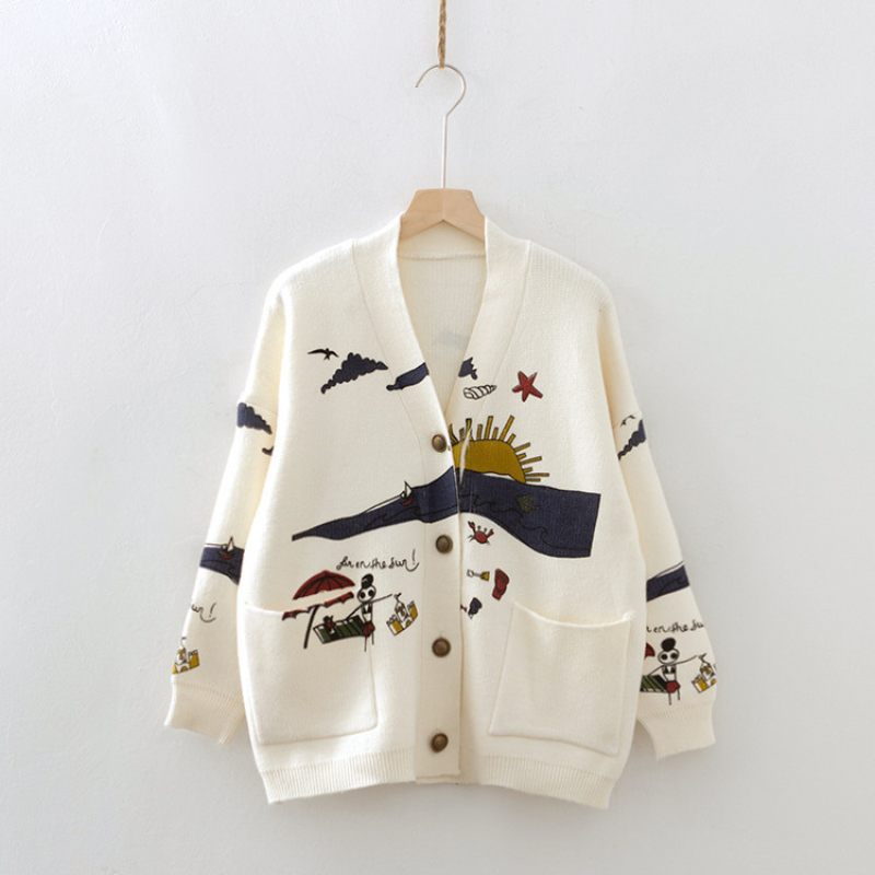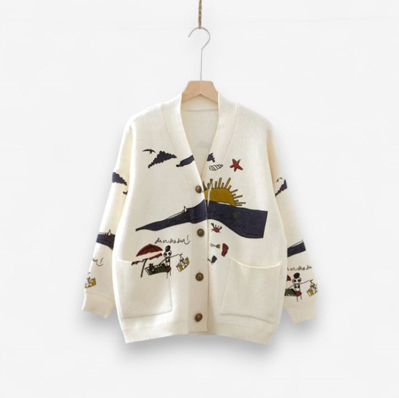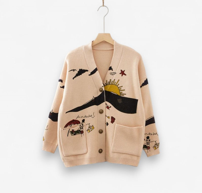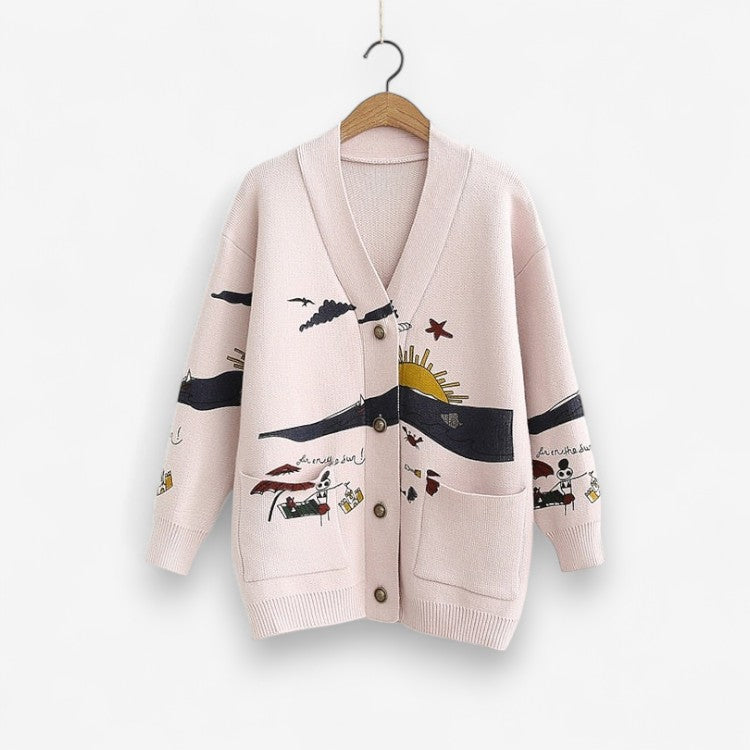 Ce cardigan présente une coupe décontractée avec un col en V, des manches longues et des poches avant.