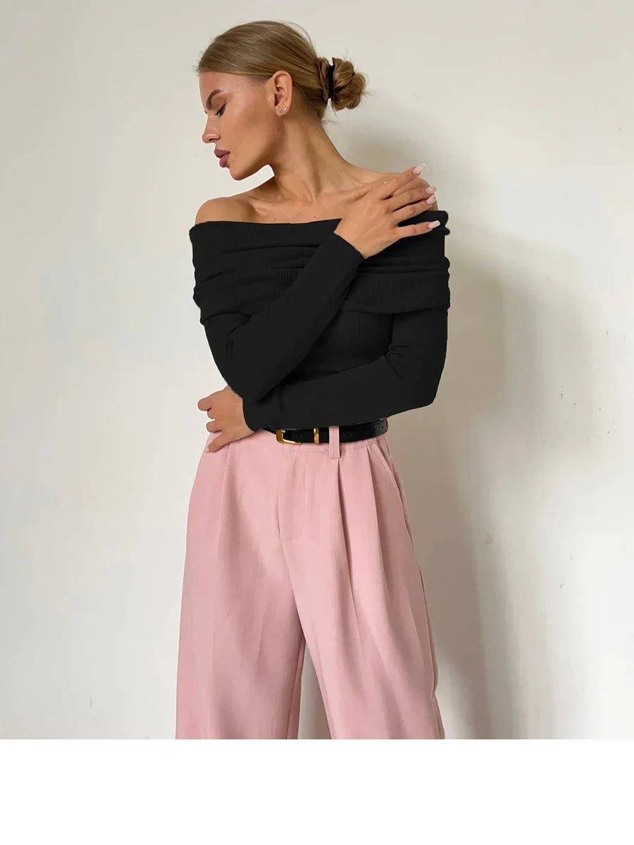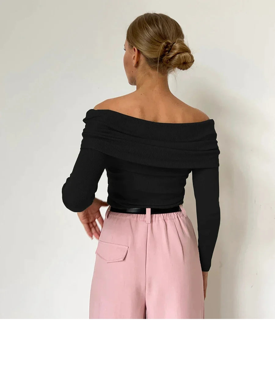 Luna – Haut côtelé élégant à épaules dénudées, manches longues et coupe ajustée