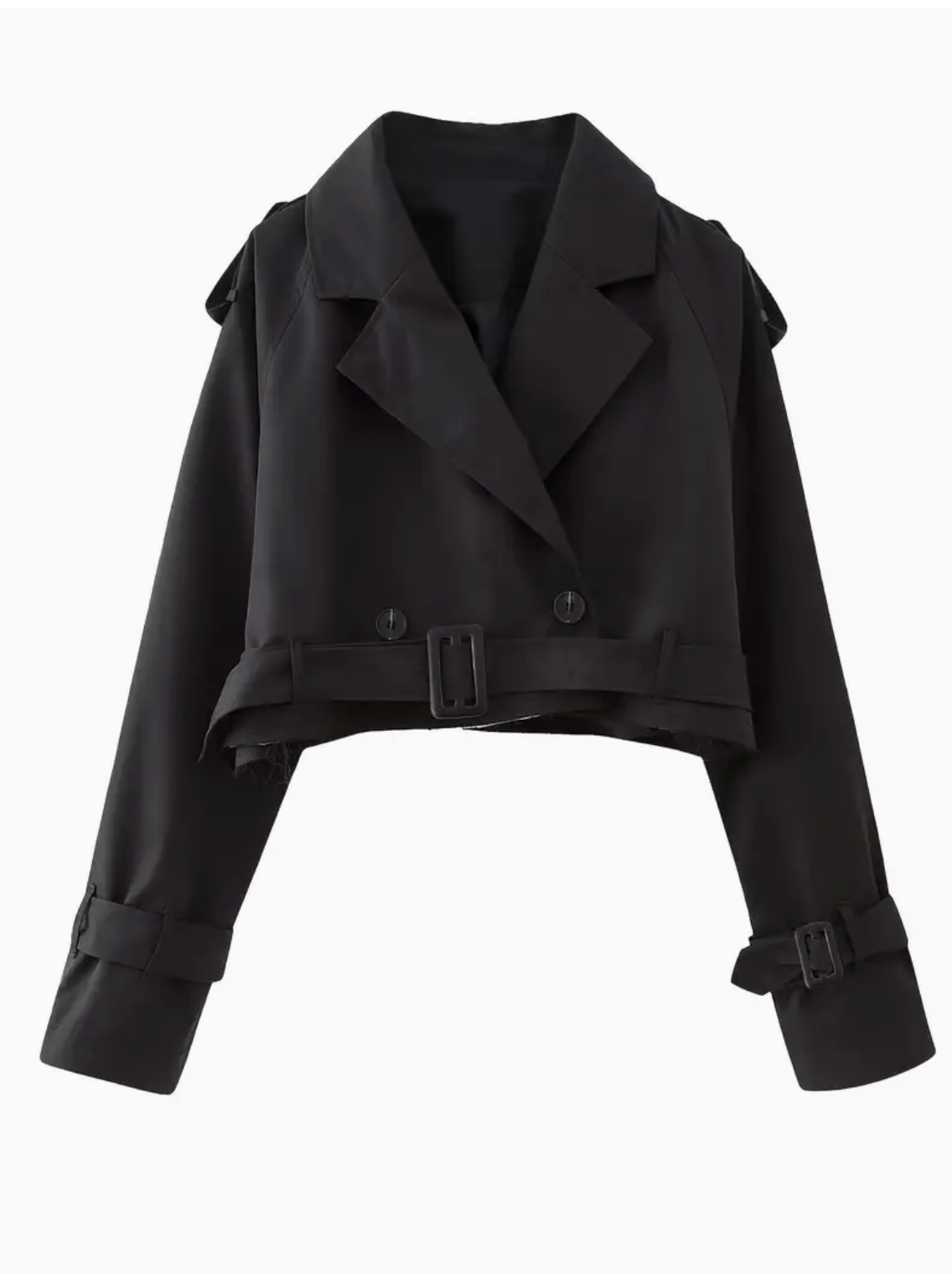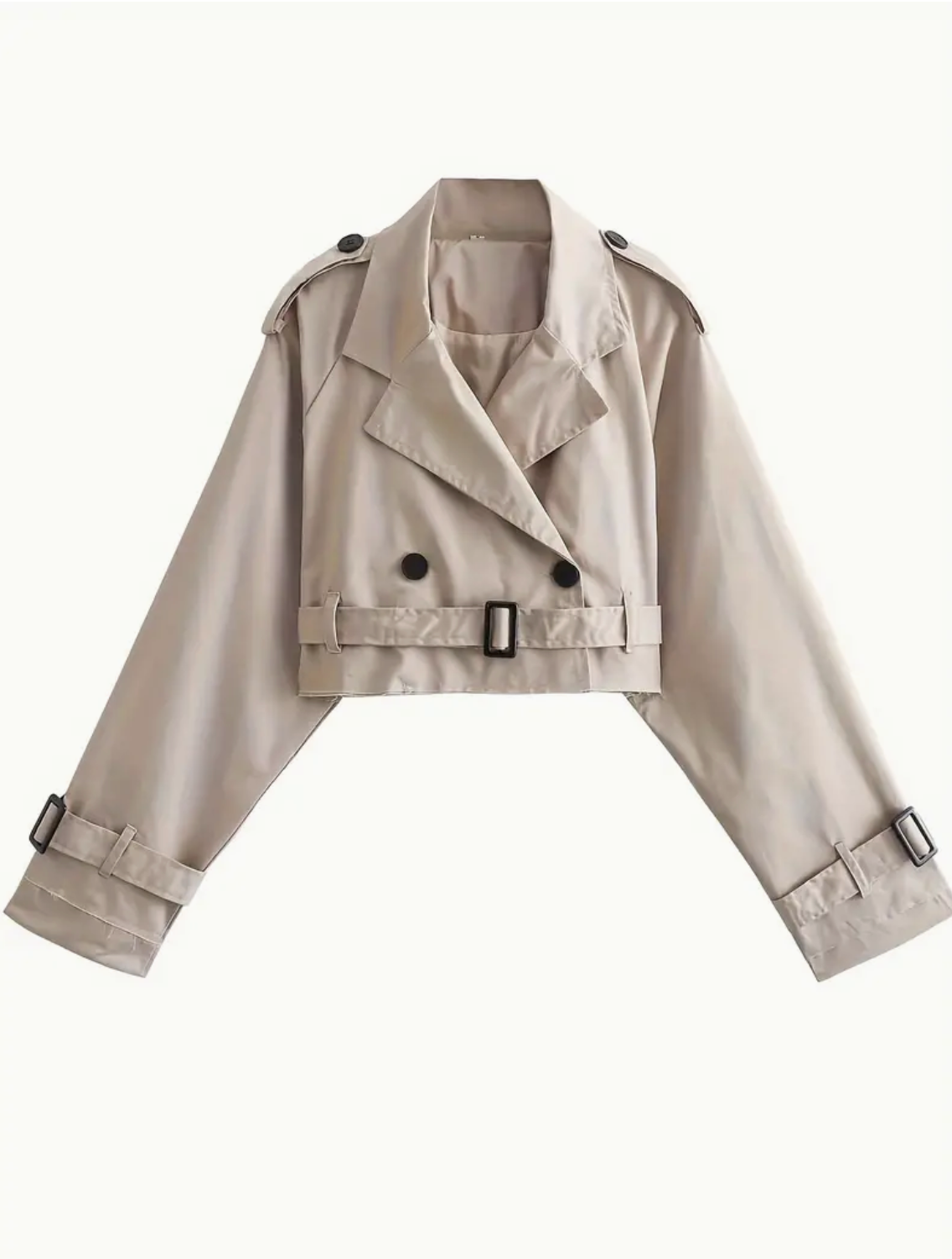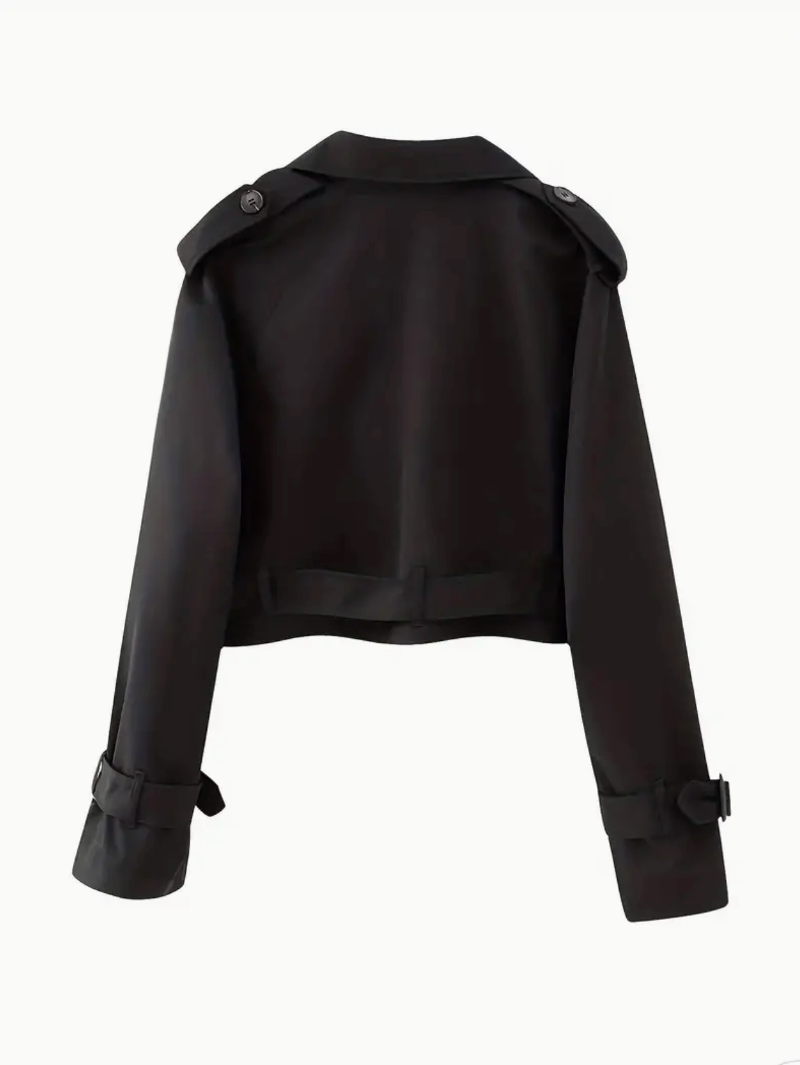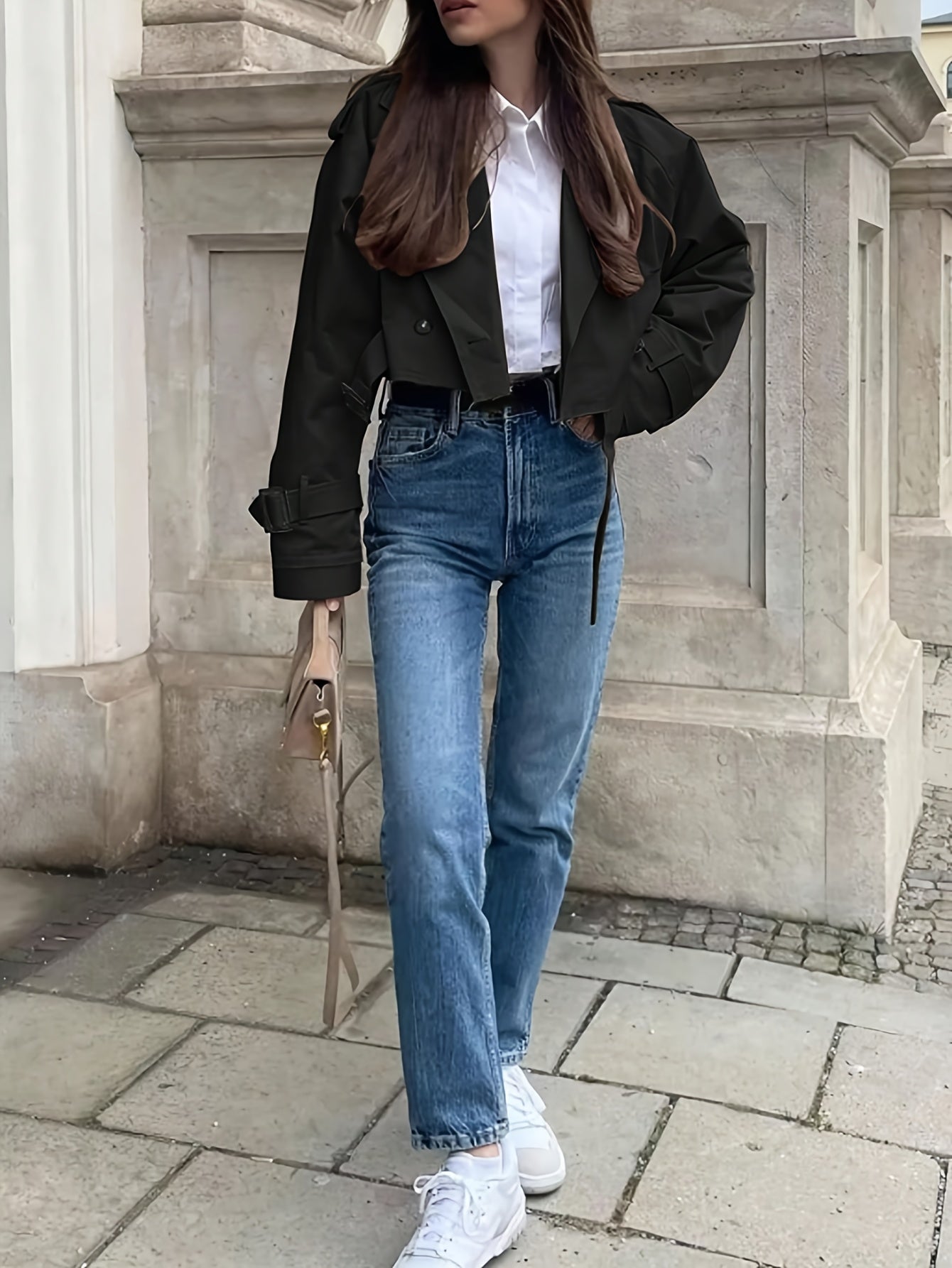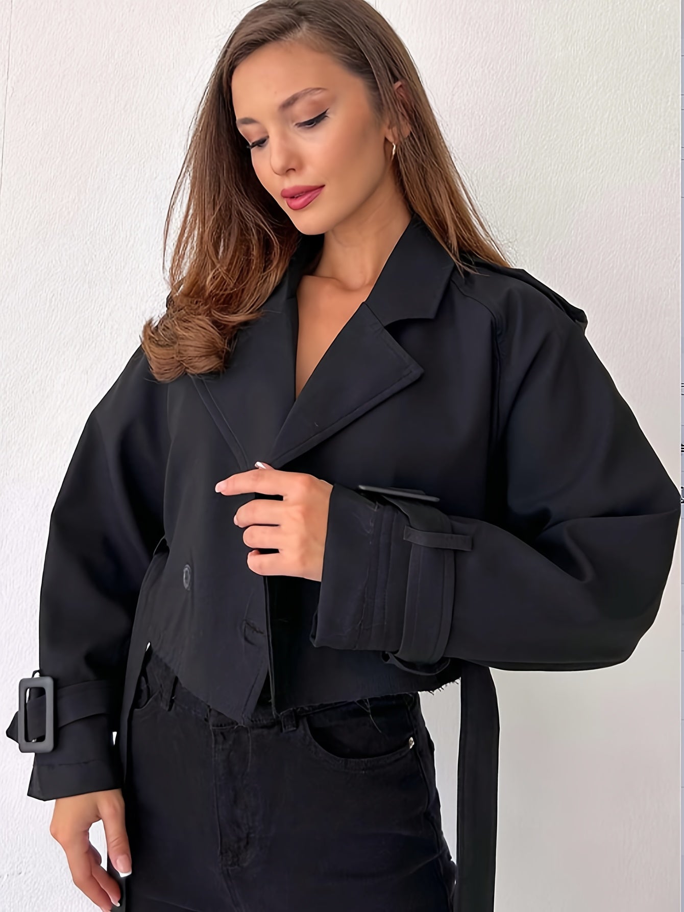 La veste courte Mirael allie un design vintage à une touche moderne. Dotée d'un devant boutonné, d'une longueur courte et d'une ceinture qui serre la taille, cette veste ajoute une touche chic à n'importe quelle tenue. Le col à revers et les manches longues offrent un look sophistiqué.