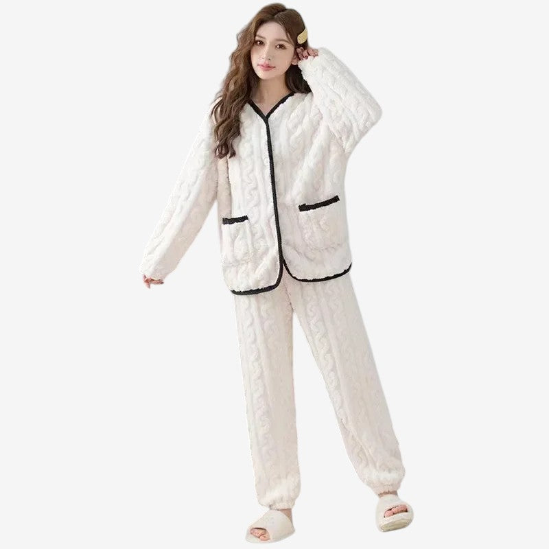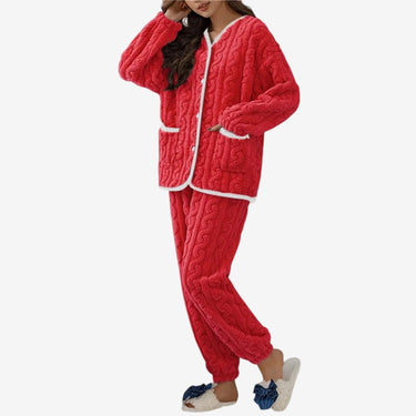 Cet ensemble comprend un haut à manches longues avec col en V et un bas assorti. Les panneaux sont en polaire, et la coupe est ample avec une taille élastique pour le bas.