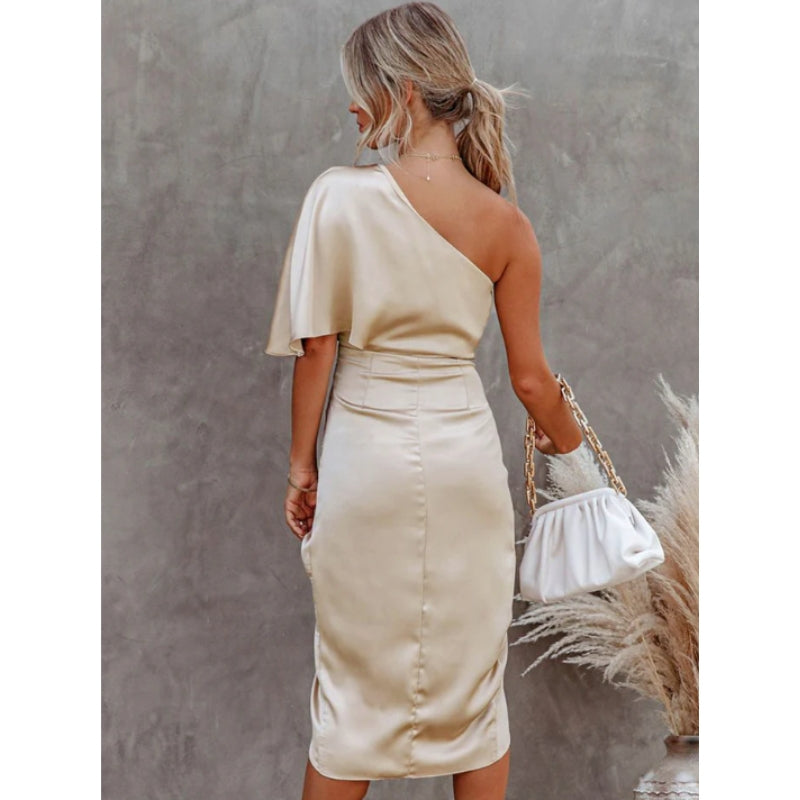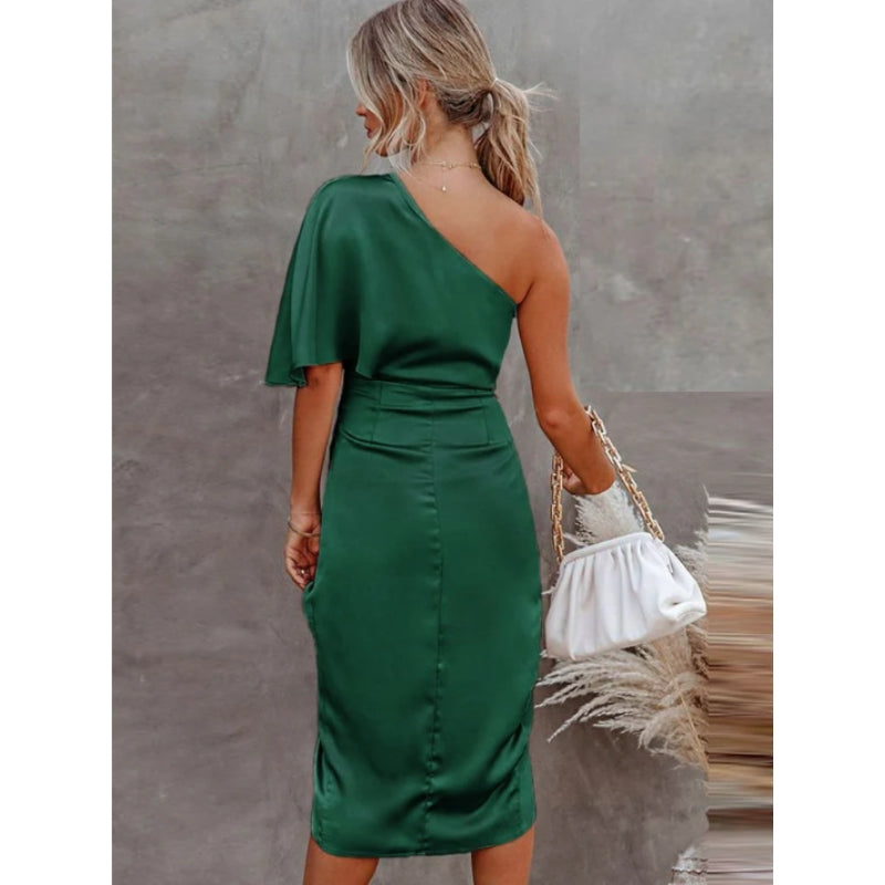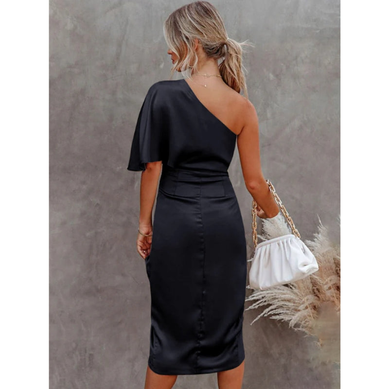 Selene – Robe ajustée classique à une épaule avec fente latérale et manche drapée