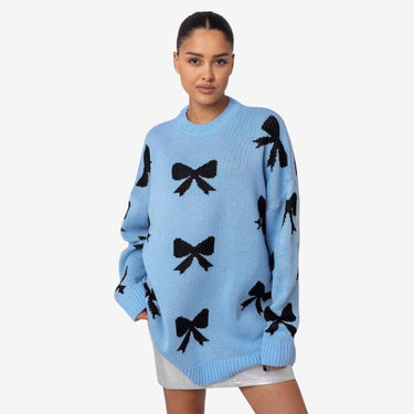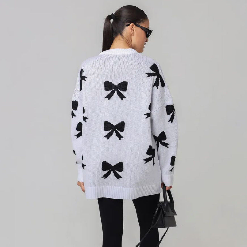 Ce pull à manches longues présente un col rond et un nœud décoratif, offrant un style charmant et polyvalent. Son design convient pour être superposé ou porté seul avec des tenues décontractées ou semi-formelles.