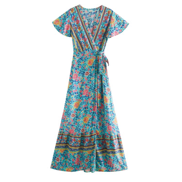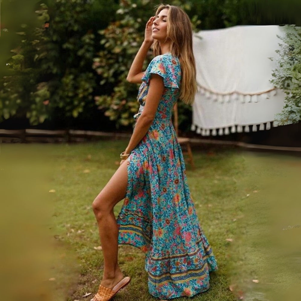 - Style : Robe à manches chauve-souris, col en V, imprimé fleuri avec fente latérale