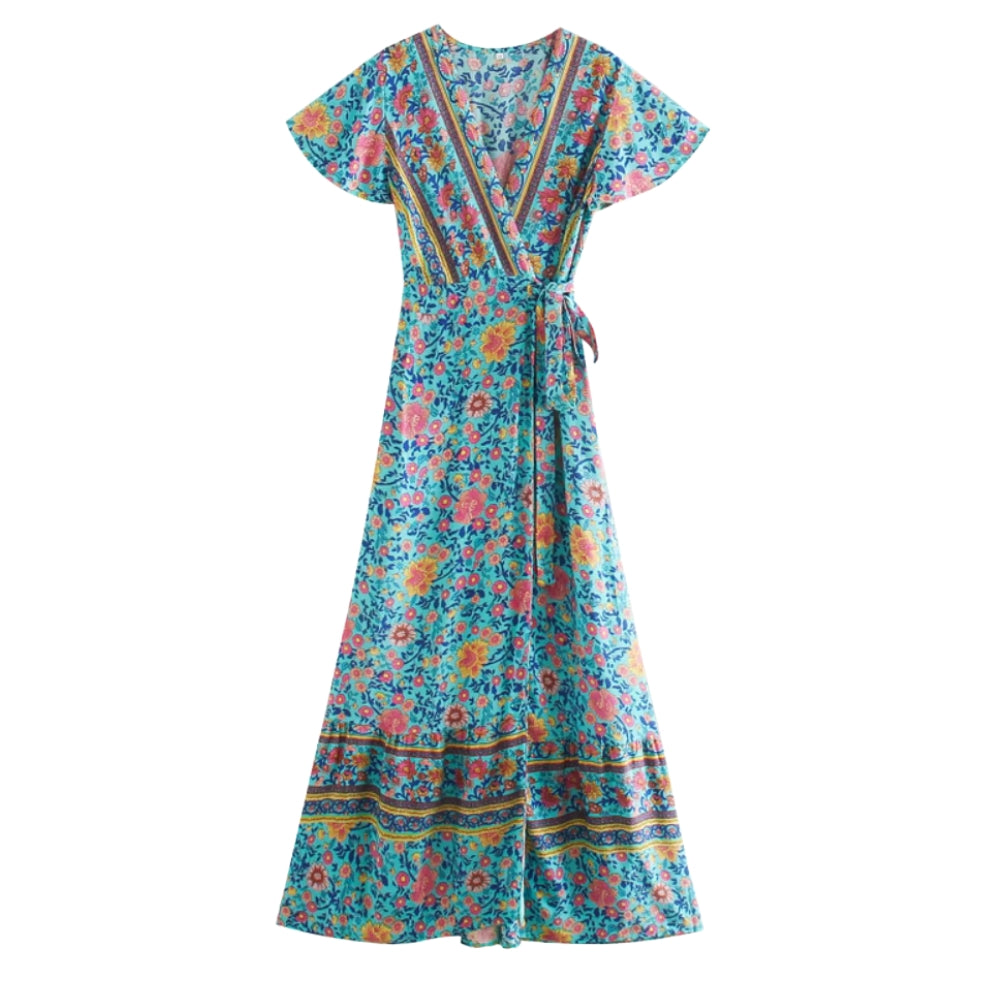 La robe Clarissa à imprimé floral présente des manches chauve-souris bouffantes qui créent une silhouette décontractée. Son décolleté en V flatteur met en valeur le décolleté, tandis que la fente latérale offre une grande liberté de mouvement et une touche de sophistication.