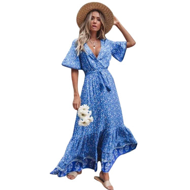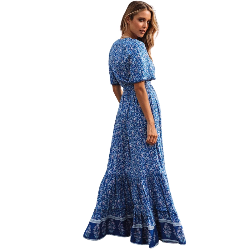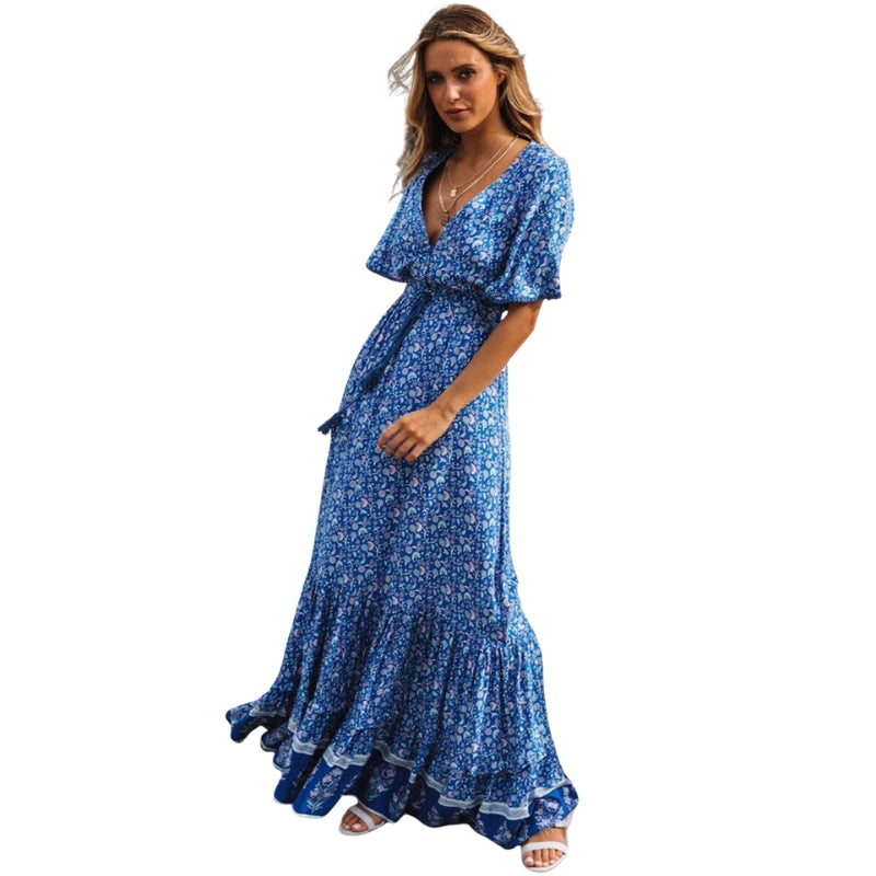 La robe Maribel présente une silhouette évasée longueur cheville avec un col en V et des manches courtes évasées. L’imprimé floral apporte une touche décorative, tandis qu’une ceinture à nouer à la taille permet un ajustement personnalisé. L’ourlet à volants ajoute du style et facilite le mouvement.