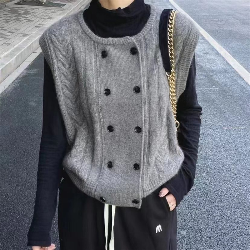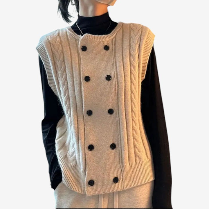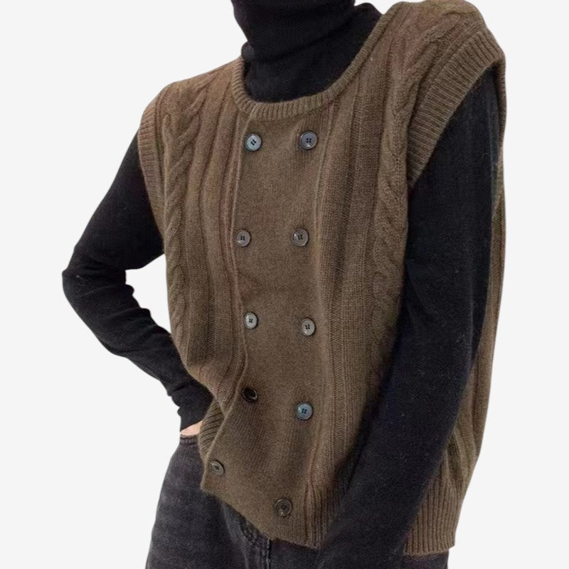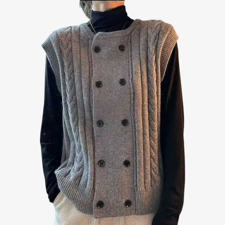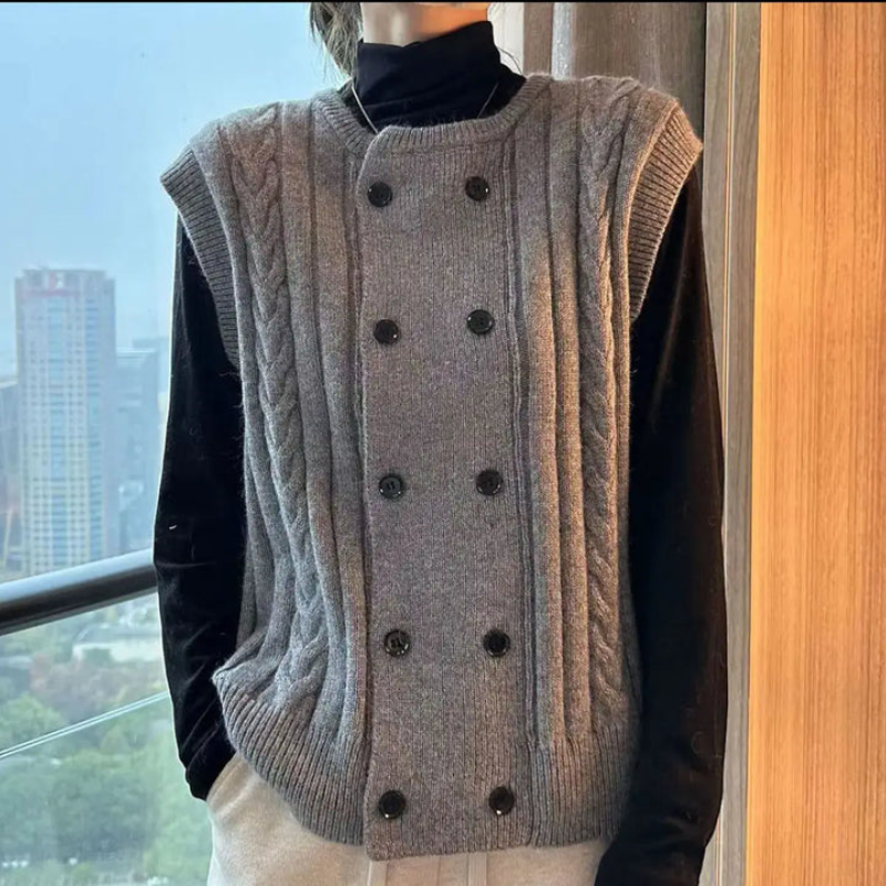 Ce gilet présente un devant à double boutonnage avec un col rond et une coupe décontractée. Sa forme sans manches et ses panneaux plats offrent une apparence simple et soignée.