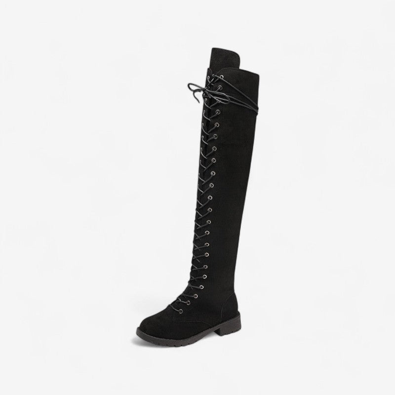 Ces bottes présentent un bout rond et une fermeture à lacets avec tige montante jusqu’au genou. Le design comprend une semelle texturée et des coutures renforcées pour une forme définie.
