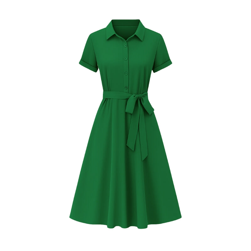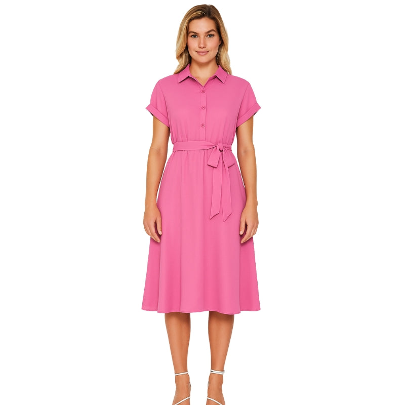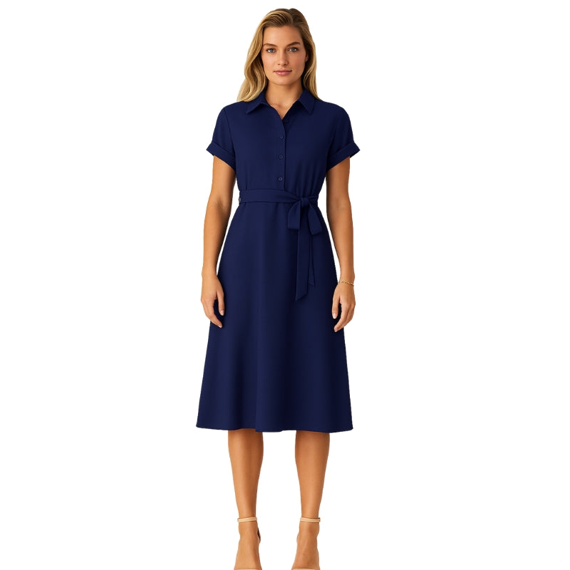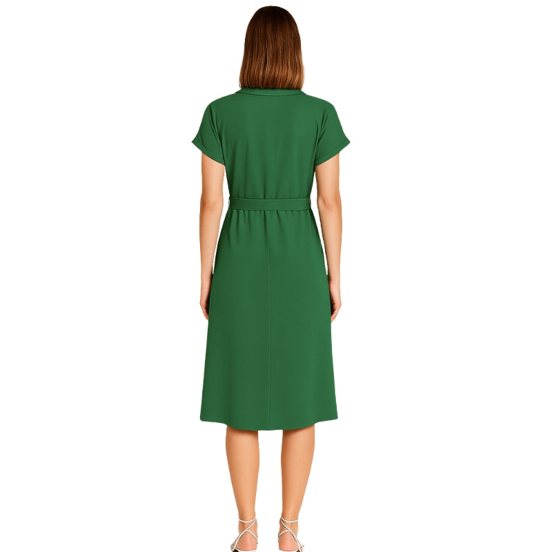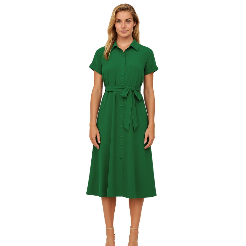 El vestido Erica presenta cuello camisero, cierre frontal abotonado y una silueta acampanada a media pantorrilla. Tiene mangas cortas con vuelta y un cinturón de tela a juego en la cintura para un look limpio y equilibrado.