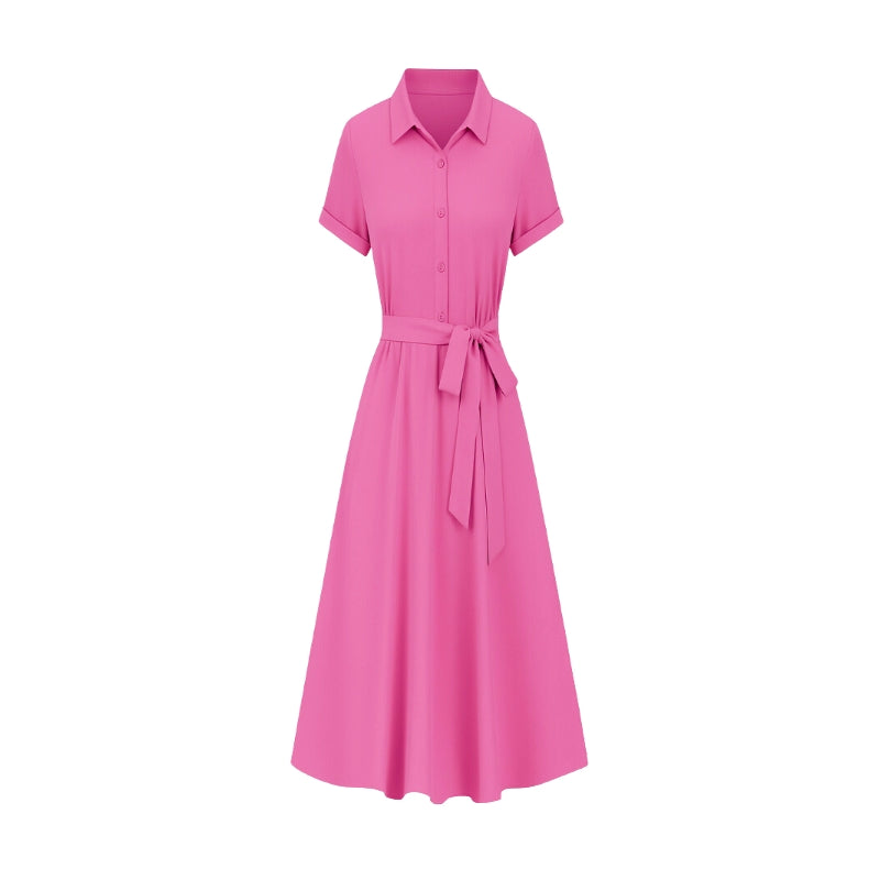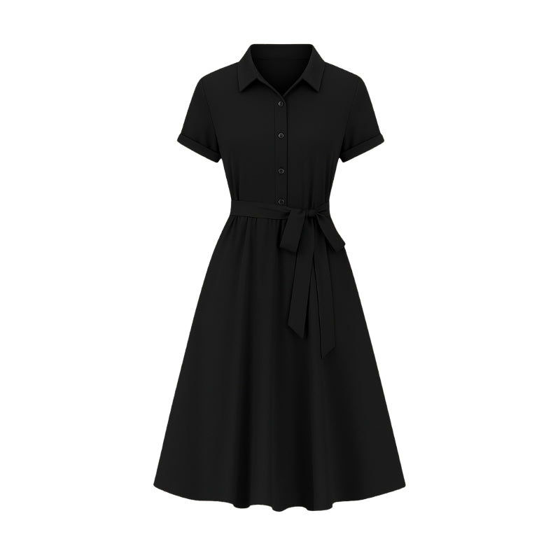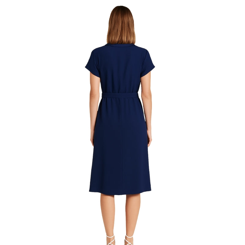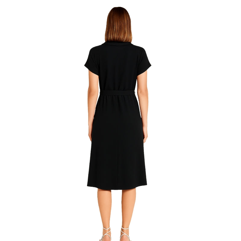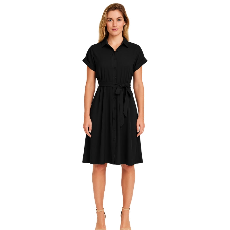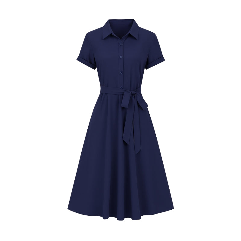El vestido Erica presenta cuello camisero, cierre frontal abotonado y una silueta acampanada a media pantorrilla. Tiene mangas cortas con vuelta y un cinturón de tela a juego en la cintura para un look limpio y equilibrado.