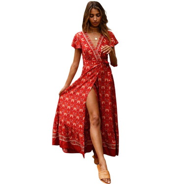 - Estilo: Vestido de manga corta, estampado floral, escote en V con abertura lateral
