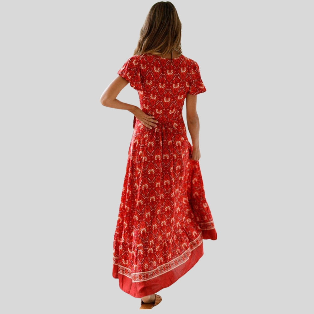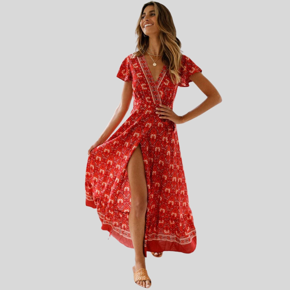 Erika – Vestido de manga corta, estampado floral, escote en V con abertura lateral