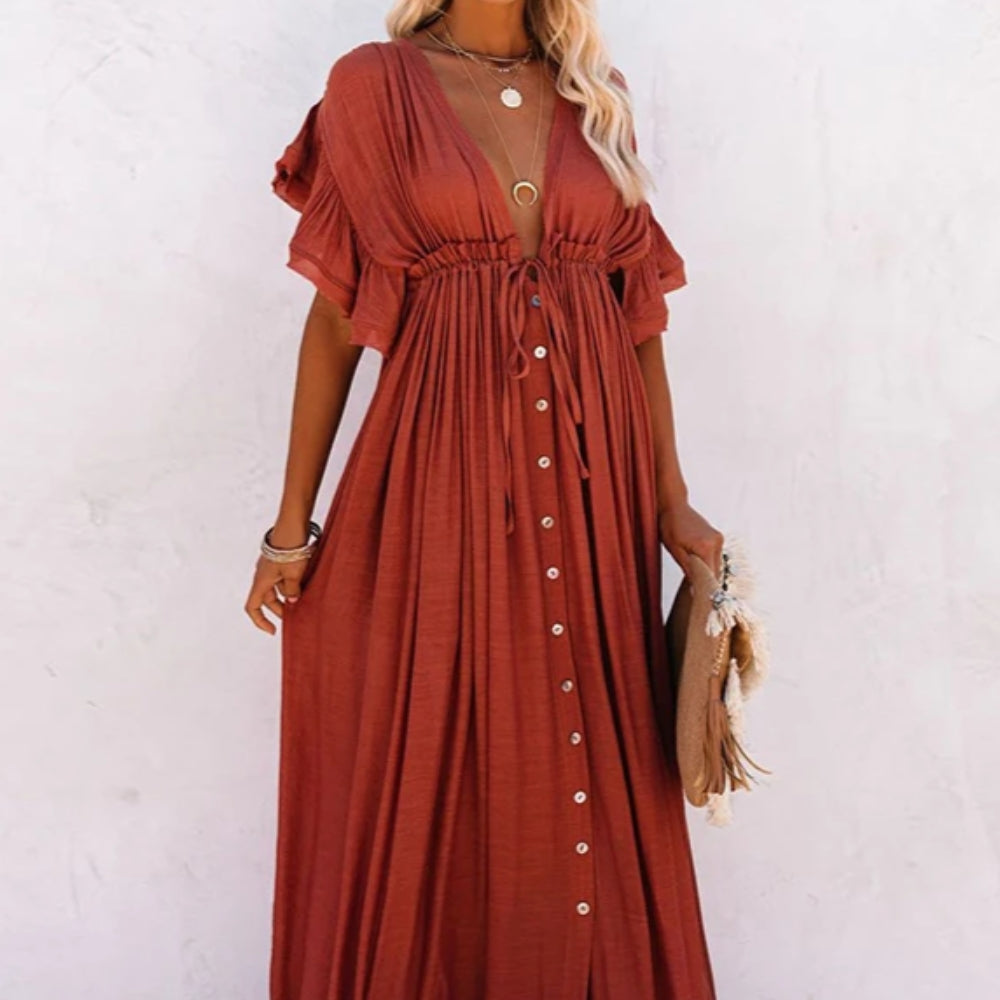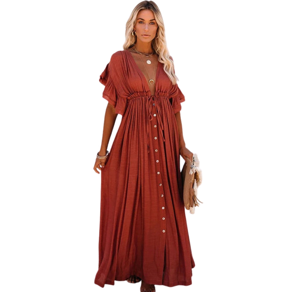 - Estilo: Vestido holgado de manga corta, escote en V con botones