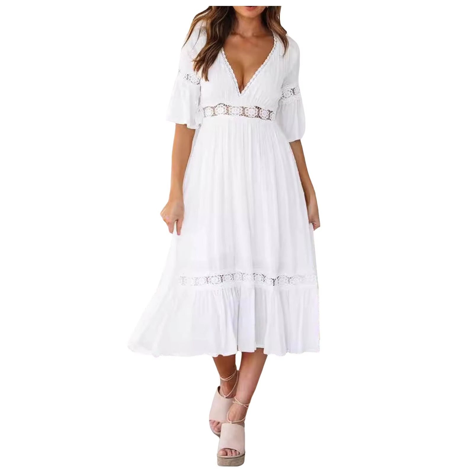 Juna – Vestido midi moderno con escote en V y mangas cortas acampanadas
