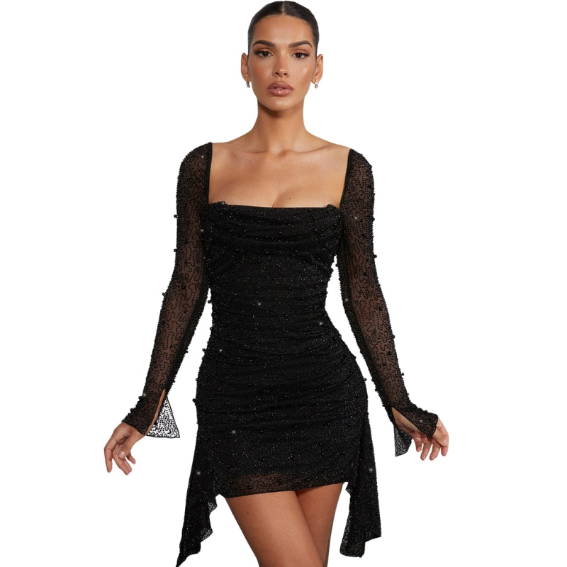 El vestido Leah está confeccionado en un tejido suave y elástico que se adapta delicadamente a las curvas, garantizando comodidad durante todo el día. Presenta un moderno escote cuadrado y mangas largas y transparentes adornadas con delicados detalles para un look sofisticado y elegante. Su silueta ajustada se ensancha ligeramente en el bajo, creando una silueta favorecedora, mientras que un sutil toque de brillo añade un elegante aire de glamour.