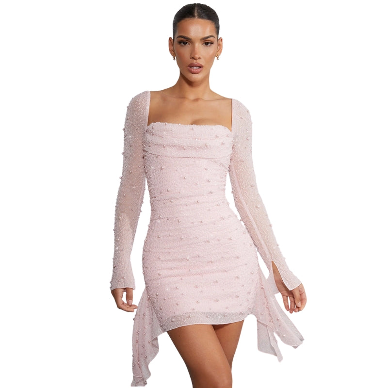 Elegante vestido corto con mangas largas transparentes adornadas