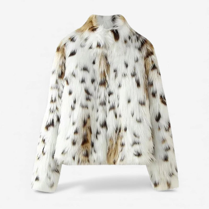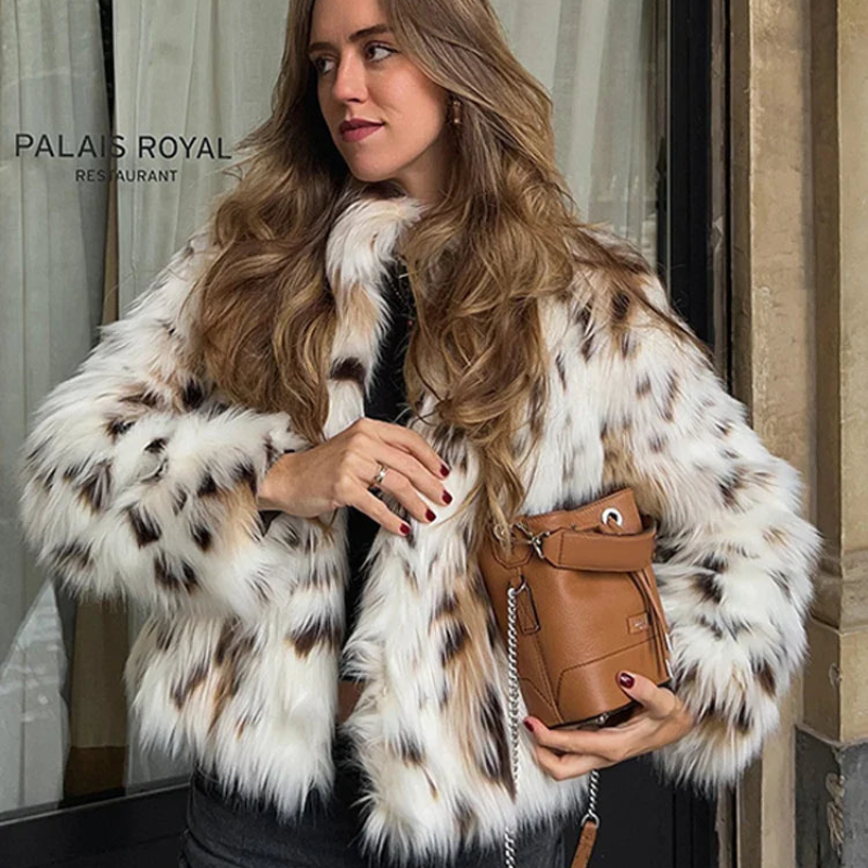 Cette veste présente un motif léopard et des manches longues. Fabriquée en fausse fourrure. Disponible en plusieurs tailles.