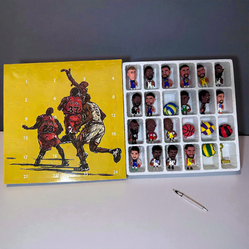 Ce calendrier de l’Avent comporte de petits compartiments contenant des poupées cartoon sur le thème du basket. Il présente une disposition structurée adaptée à une exposition sur table ou étagère.