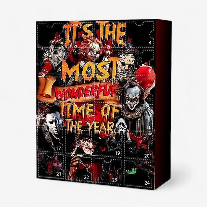 Este calendario de adviento de Halloween presenta personajes de películas de terror, añadiendo un toque divertido y espeluznante a la cuenta atrás. Perfecto para los fans, aporta emoción y un ambiente festivo durante todo el mes.