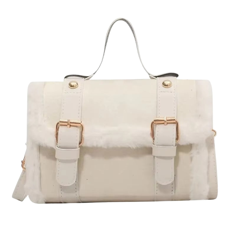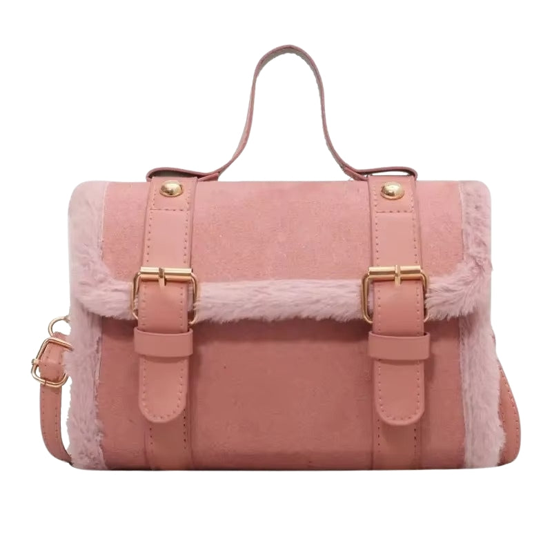 La borsa a tracolla Emma presenta lati in morbida pelliccia abbinati a un corpo principale in resistente tessuto effetto camoscio. La sua forma rettangolare compatta è progettata per contenere gli oggetti essenziali di tutti i giorni senza ingombro. La chiusura a patta con fibbie aggiunge un tocco classico, mentre la tracolla regolabile e il piccolo manico superiore offrono molteplici opzioni di trasporto.