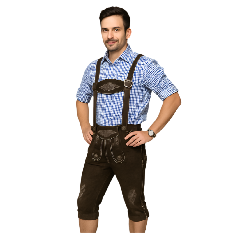 Metti in mostra il tuo stile con questi pantaloni di media lunghezza realizzati in pregiata pelle marrone. Caratterizzati da raffinati dettagli stampati e pratiche tasche, questi pantaloni uniscono il fascino tradizionale dell'Oktoberfest a un design moderno.
