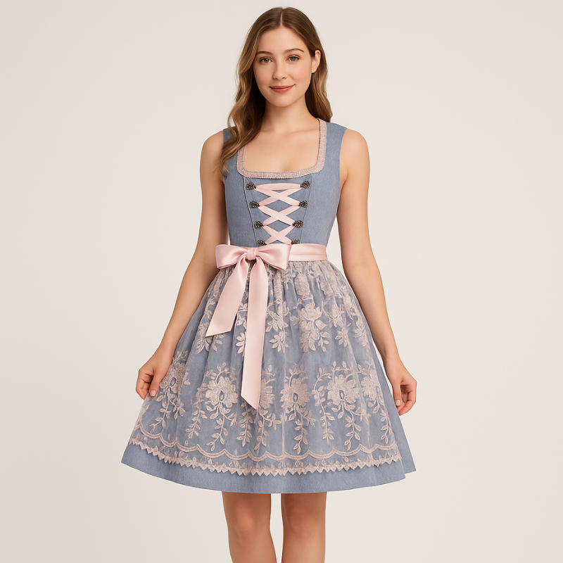 L'abito Hazel offre una raffinata interpretazione dello stile Oktoberfest, con un taglio senza maniche, una scollatura quadrata e un delicato colletto in pizzo. La lunghezza midi e il corpetto aderente creano una silhouette strutturata, festosa e senza tempo.
