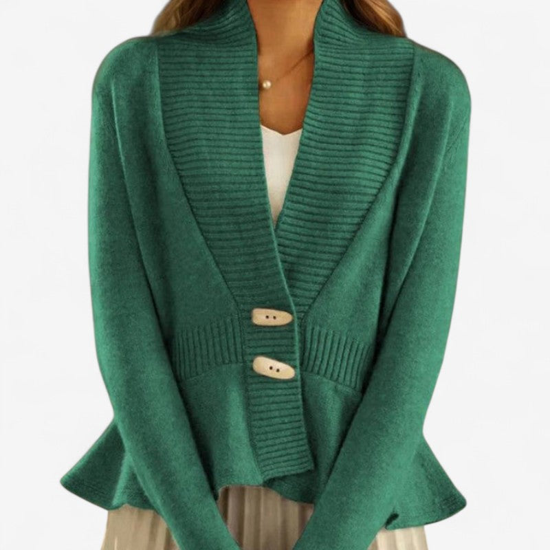 Il cardigan Helen presenta uno scollo a V con dettagli arricciati e un taglio a peplo che valorizza la figura. Con le sue maniche lunghe e la silhouette aderente, è un capo elegante e femminile che si abbina a tutti i tuoi outfit.