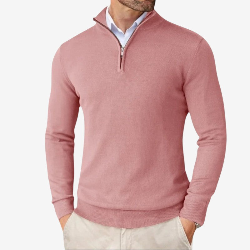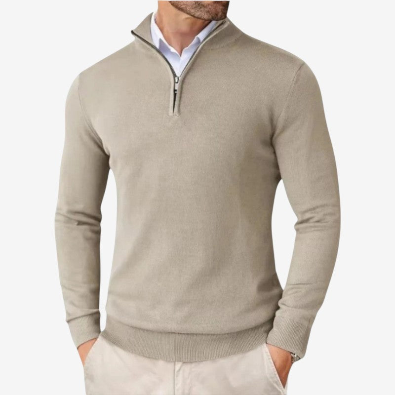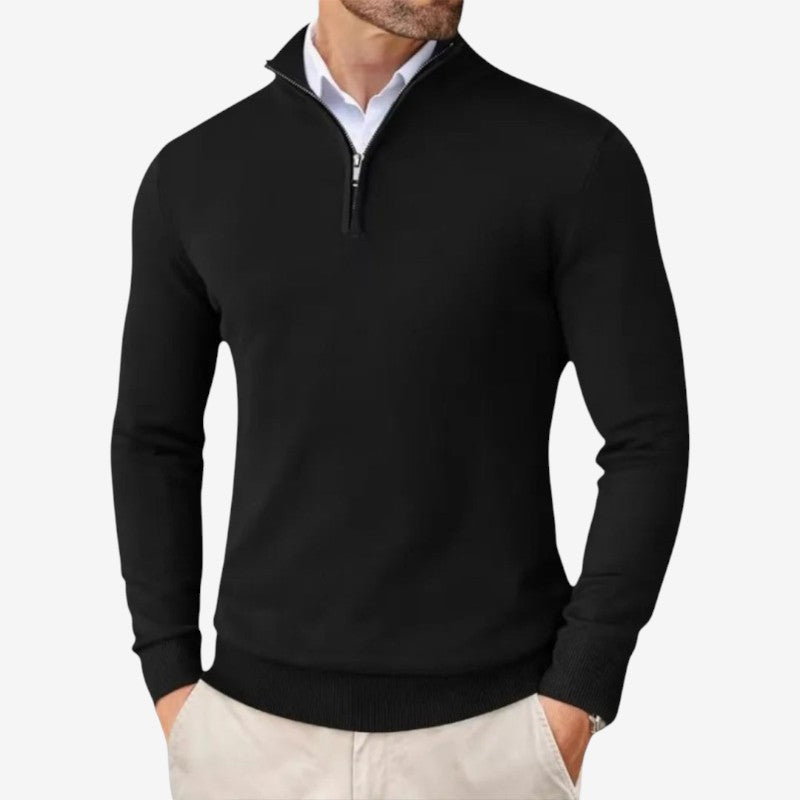 Il maglione James presenta una chiusura a mezza zip e maniche lunghe, combinando il comfort classico con una silhouette elegante. Il suo taglio aderente offre un look raffinato, ideale da indossare da solo o a strati per stili casual o semi-formali.