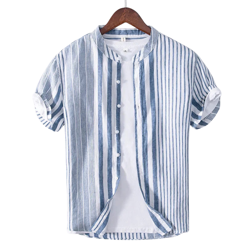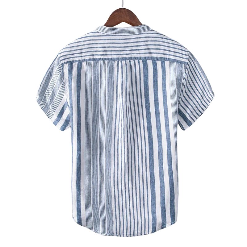 La camicia Joshua è realizzata in misto lino, perfetta per l'uso quotidiano. Con maniche a tre quarti, un elegante girocollo e un elegante taschino sul petto, coniuga semplicità e stile. Disponibile in rosa tenue e blu, questa camicia è adatta sia per occasioni casual che semi-formali.
