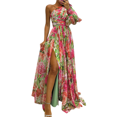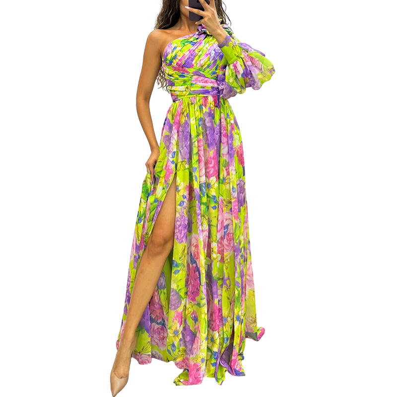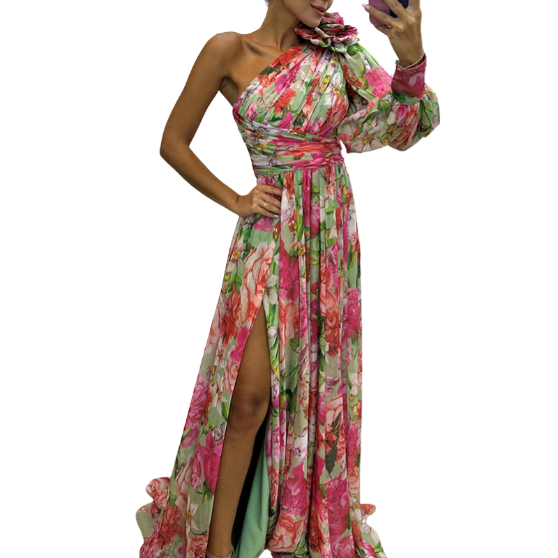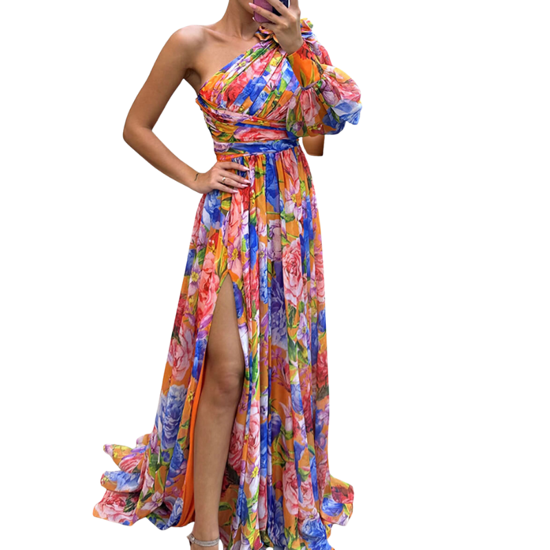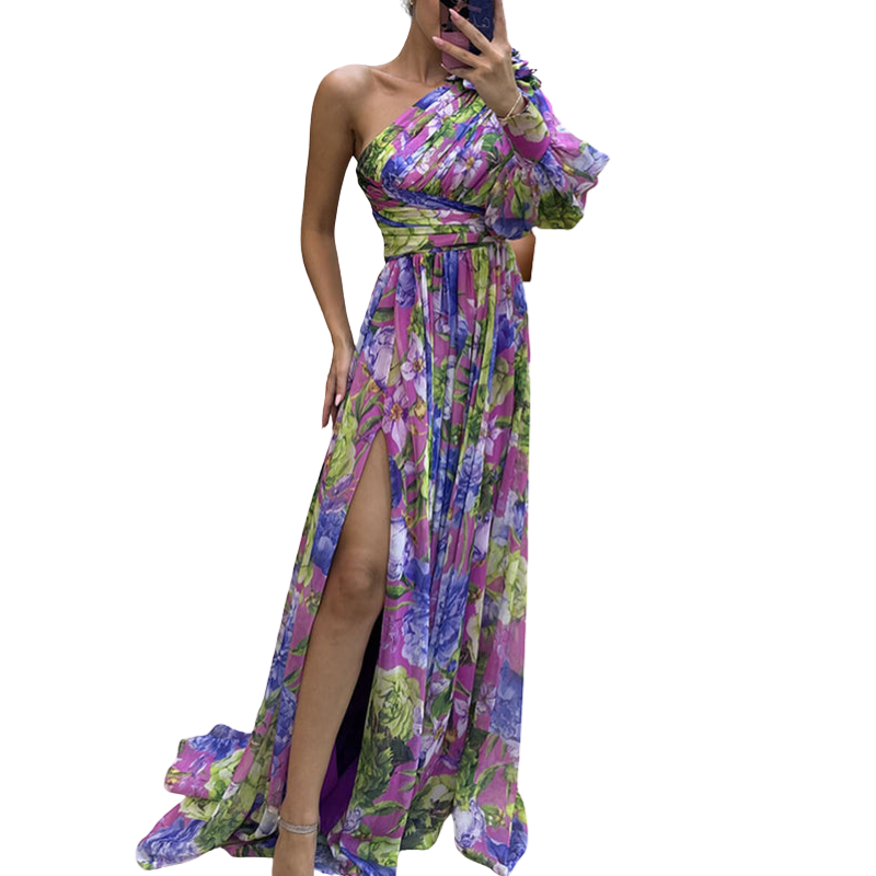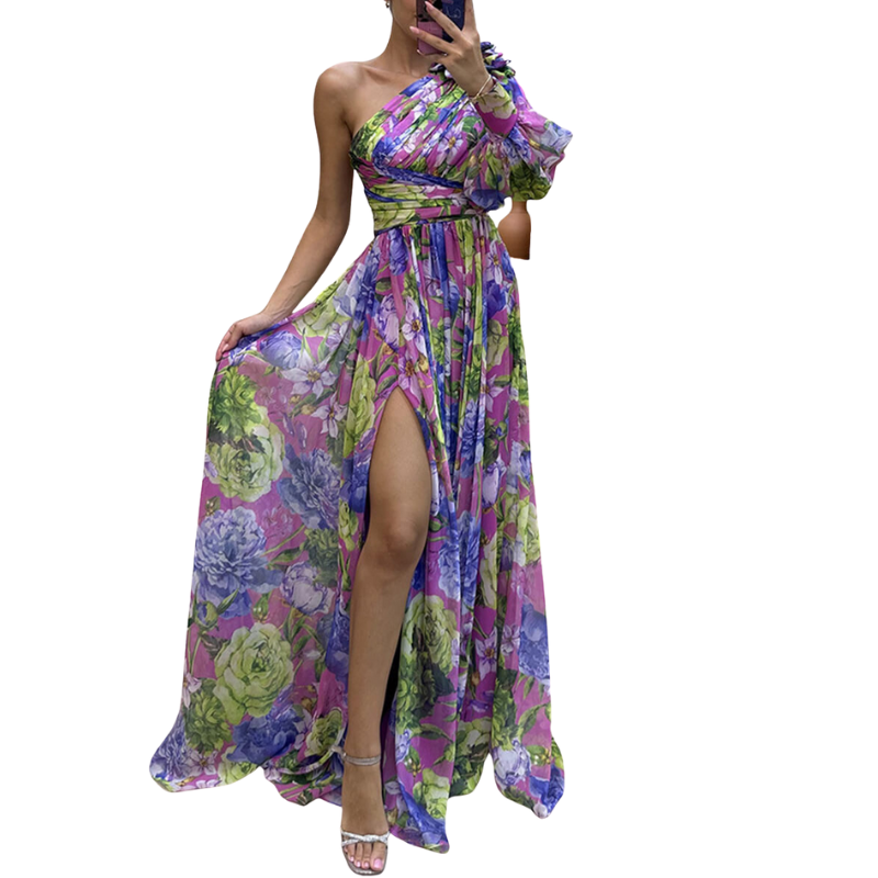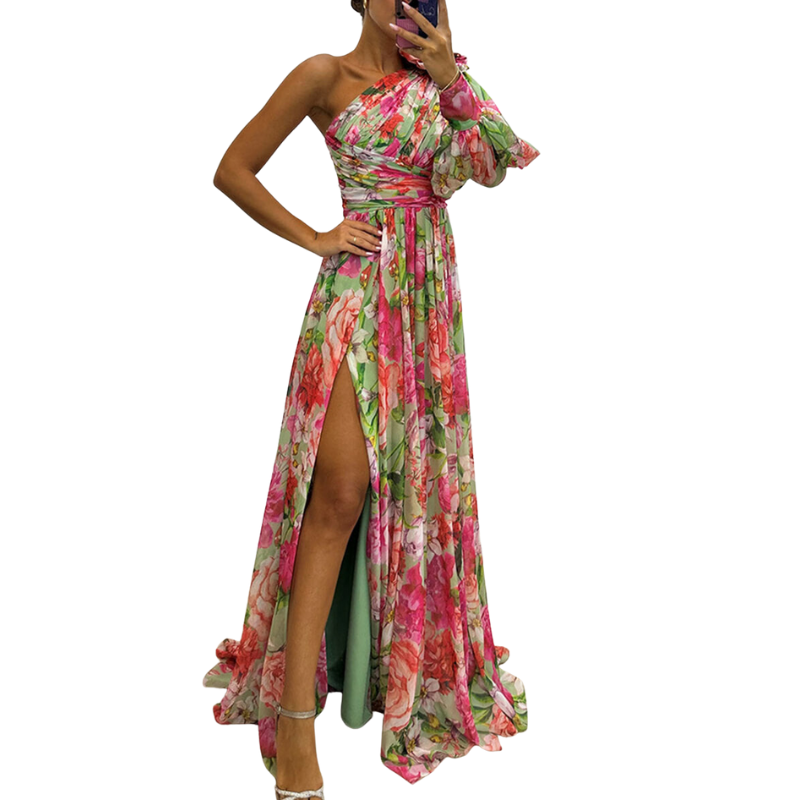 Juliette – Abito lungo con stampa floreale, spacco laterale e monospalla