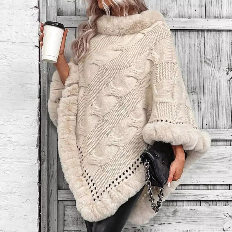 Klara – Poncho ampio in maglia a trecce con bordo in pelliccia