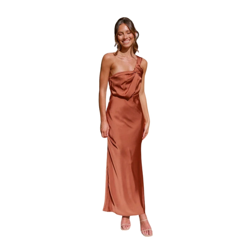 L'abito Leilani incarna una raffinata raffinatezza grazie all'elegante scollatura asimmetrica monospalla e alla silhouette senza maniche. La sua finitura liscia offre una delicata lucentezza e un leggero drappeggio, rendendolo confortevole ed elegante.