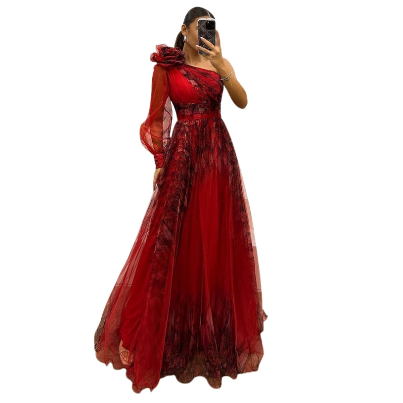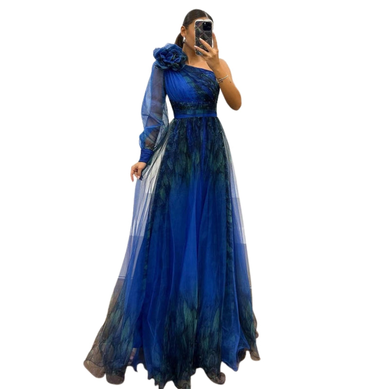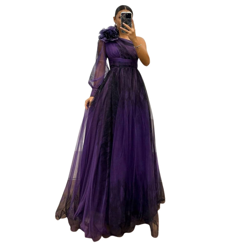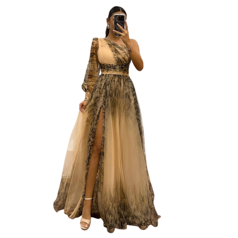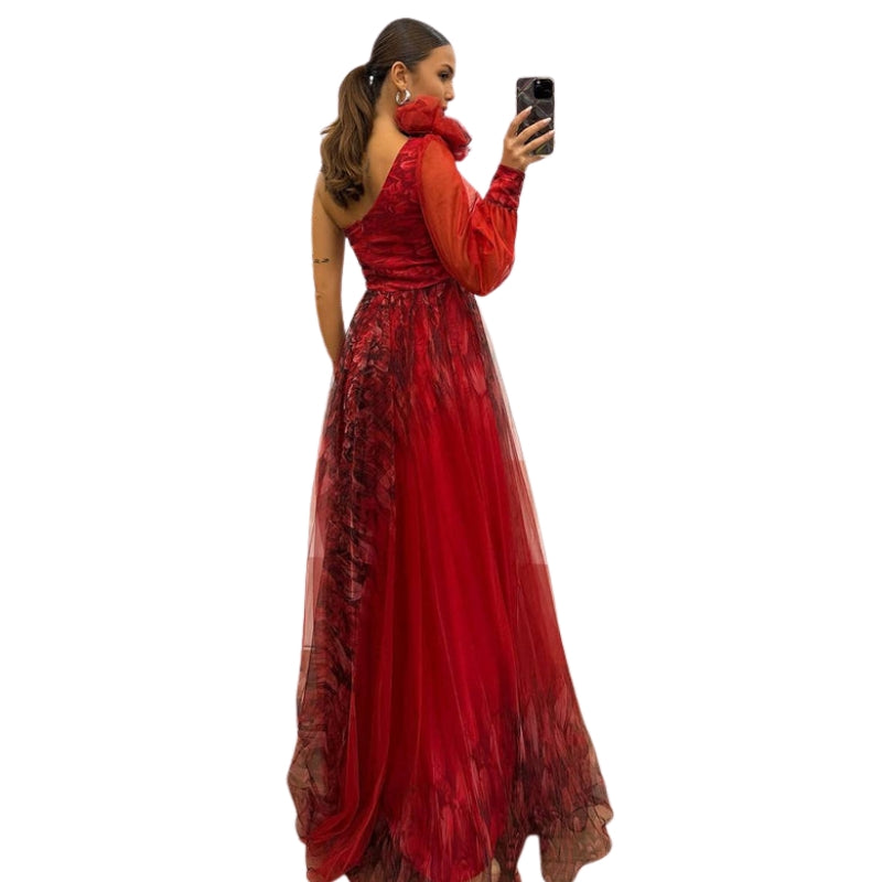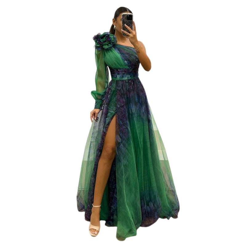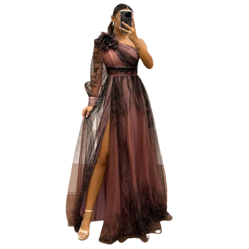 Marie – Abito lungo monospalla con maniche lunghe e spacco laterale