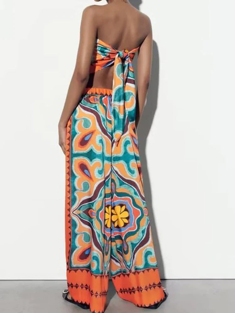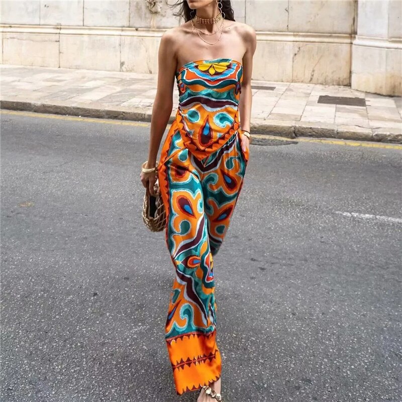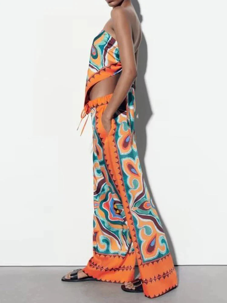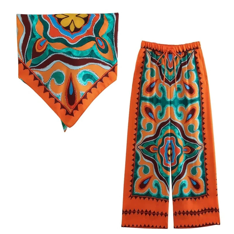 Maya è un vivace completo due pezzi che ti invita a esprimere il tuo spirito bohémien. Questo colorato completo include un top a tubino alla moda abbinato a pantaloni a gamba larga, entrambi decorati con una stampa vivace. Perfetto per le giornate di sole e i momenti di relax, Maya fa risplendere la fashionista che è in te, garantendoti il ​​massimo comfort.