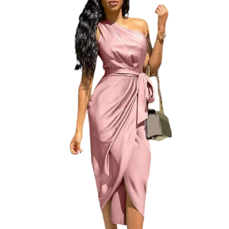 L'abito midi Serena coniuga uno stile moderno con un taglio che valorizza la figura. Progettato con una scollatura monospalla asimmetrica e una silhouette avvolgente, mette in risalto la clavicola e le spalle, avvolgendo elegantemente il corpo. La cintura in vita accentua la figura per un look perfettamente sartoriale.