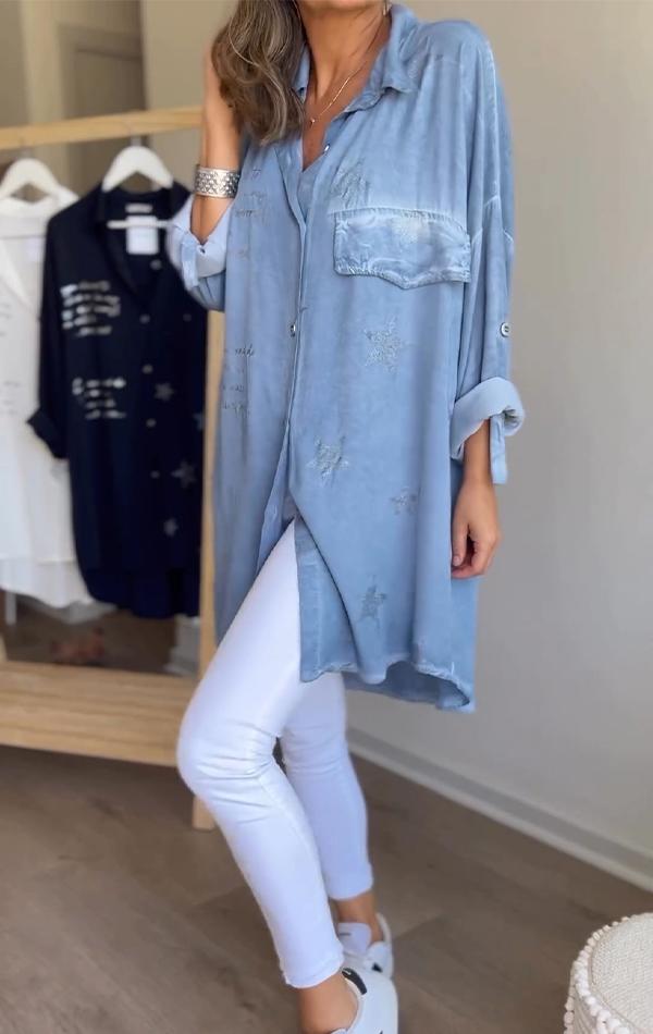 La camicia monopetto Thora è un sorprendente mix di eleganza e stravaganza. Caratterizzata da un'accattivante stampa a stelle, questa camicia aggiunge un tocco di stravaganza al tuo guardaroba, mantenendo una silhouette sofisticata. Realizzata con materiali di alta qualità, promette comfort e resistenza, rendendola la scelta perfetta sia per le occasioni casual che per quelle eleganti.