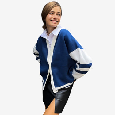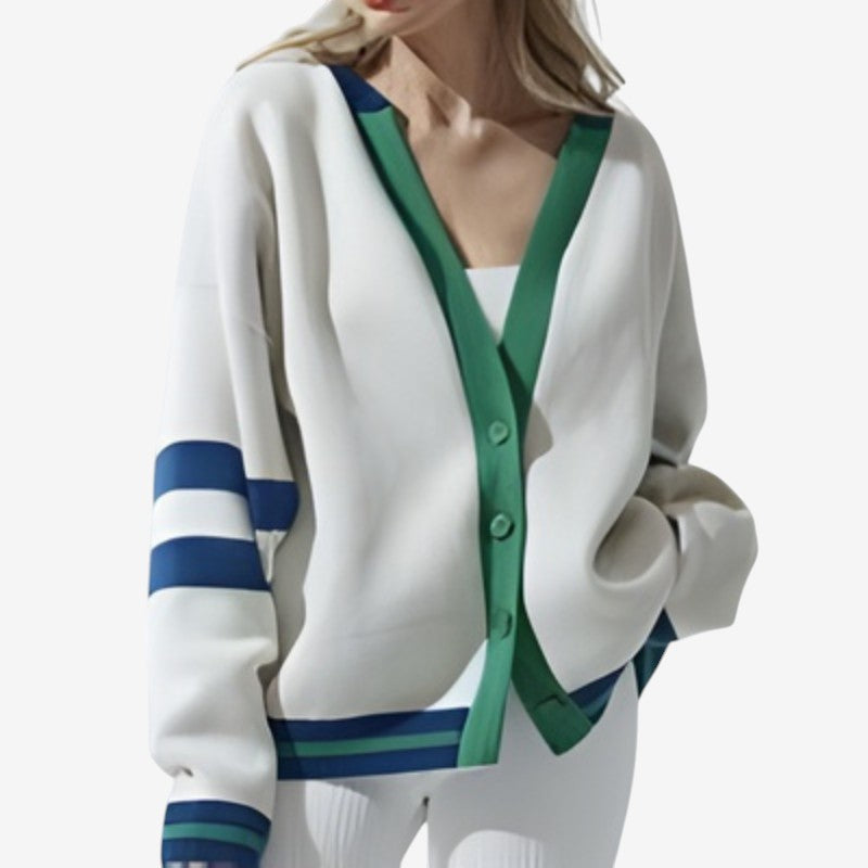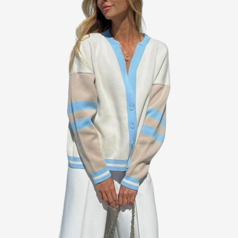 Le cardigan à manches longues Alice présente un col en V et une fermeture à boutons sur le devant avec un motif rayé. Son design tricoté offre une apparence soignée et structurée, le rendant idéal à superposer sur des hauts ou des robes.