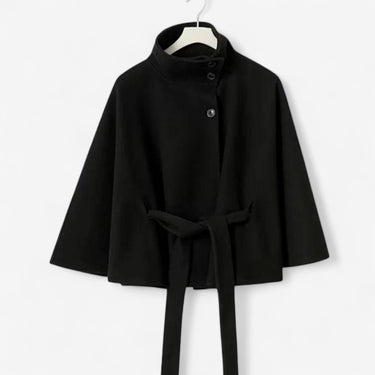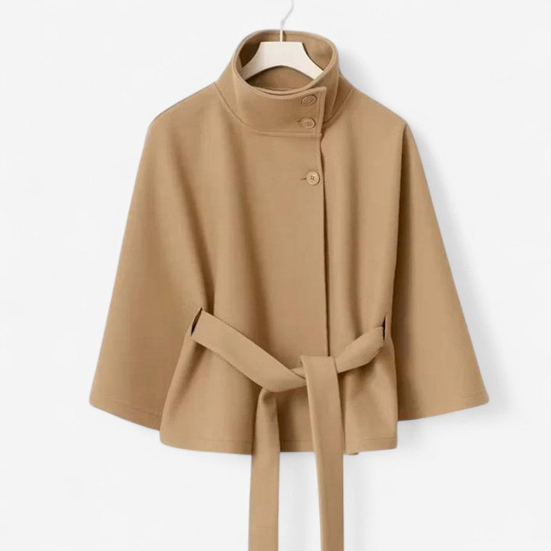 Il cappotto Angela presenta un collo alto, maniche a mantella e cintura in vita con chiusura a bottone. La sua silhouette strutturata offre un look chic ed elegante per le giornate più fresche.