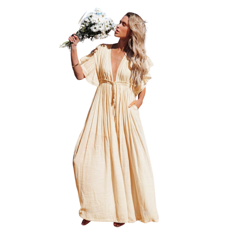 - Stile: Abito lungo con maniche a pipistrello, scollo a V e vestibilità ampia