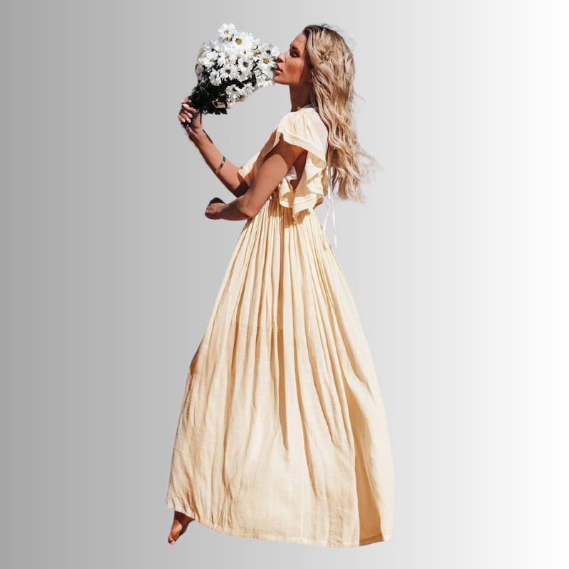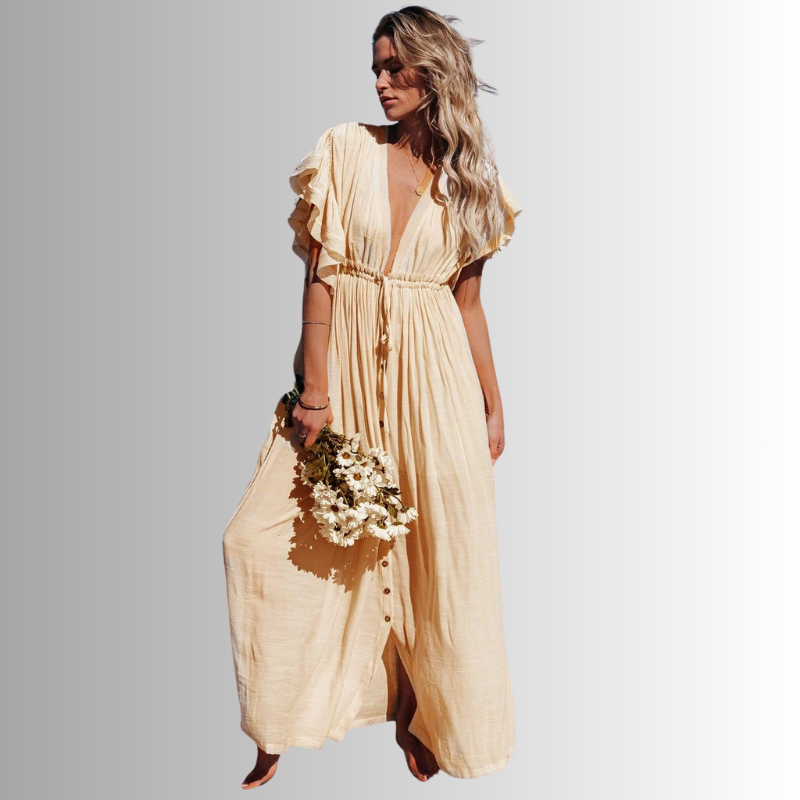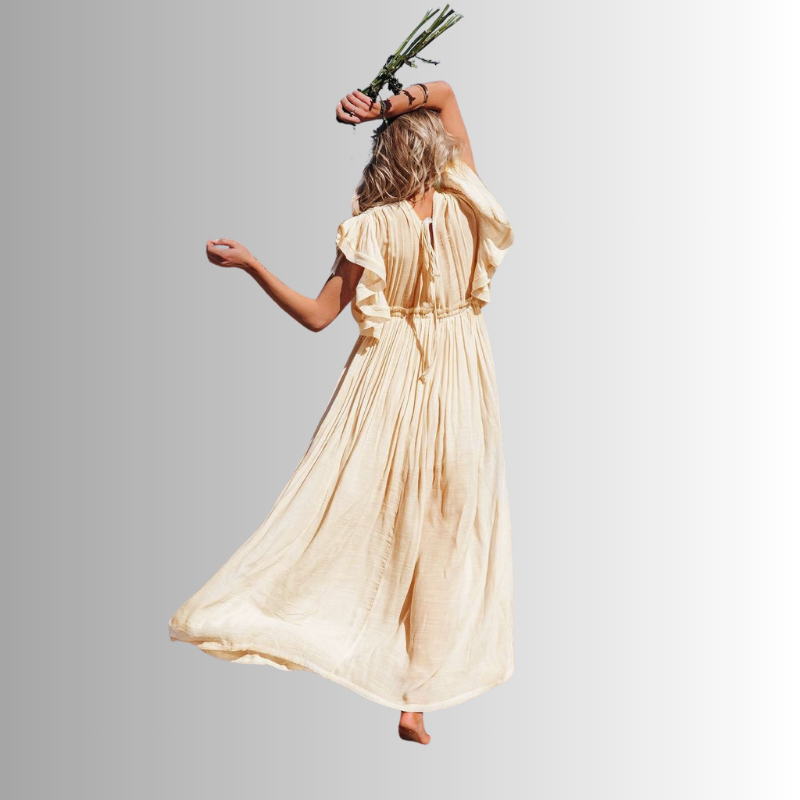 L'abito lungo Angelika con maniche a pipistrello presenta una scollatura a V e una silhouette ampia e fluida per una libertà di movimento ottimale. Versatile e chic, questo abito unisce eleganza e praticità, perfetto per uscite informali o incontri informali.
